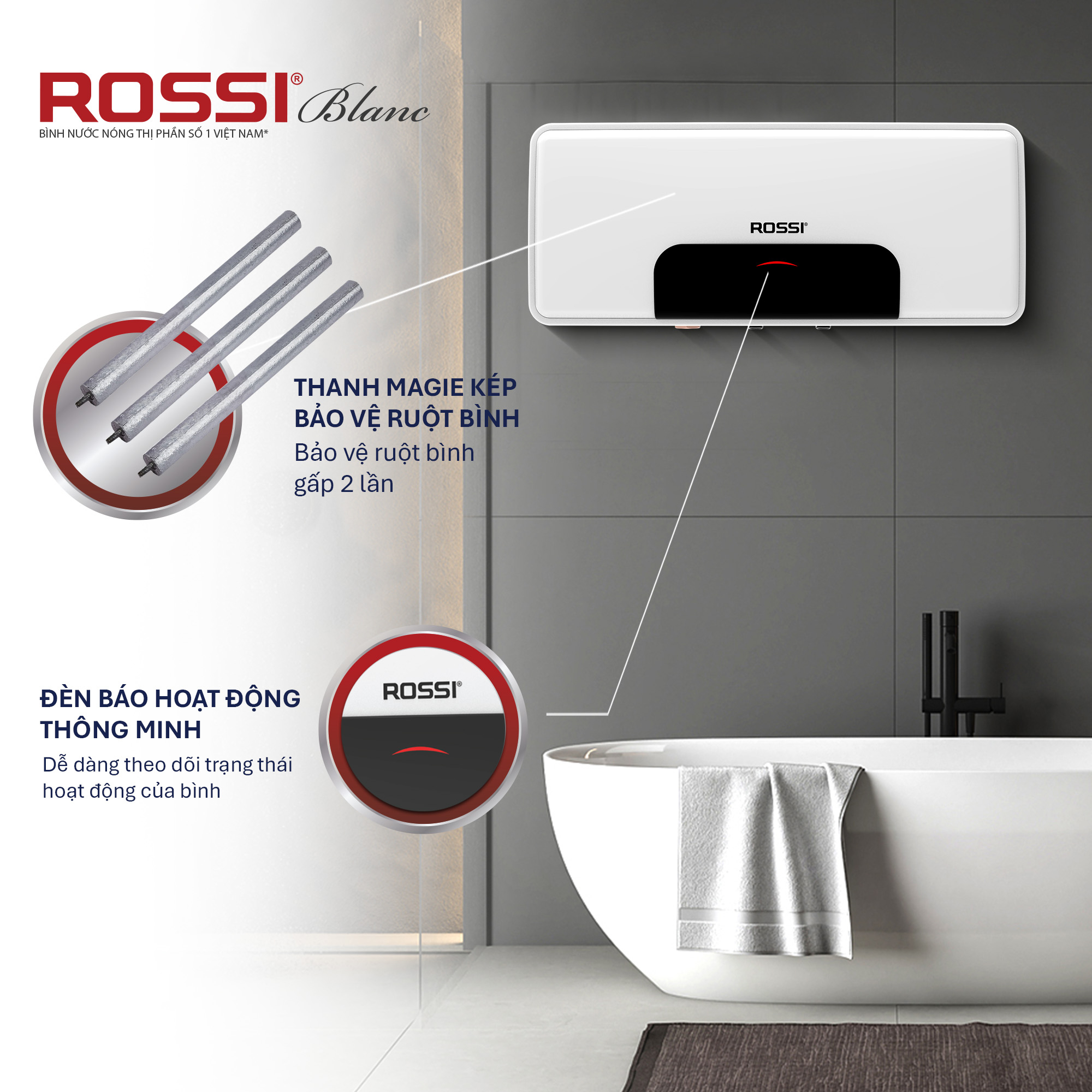 Bình nước nóng Rossi Blanc – Tinh hoa của sự tinh tế. Rossi Blanc thực sự là một kiệt tác nghệ thuật mang đến sự sang trọng và tinh tế cho mọi không gian phòng tắm. Công nghệ tiên tiến giúp bình nước nóng hoạt động hiệu quả, tiết kiệm điện năng tối đa, đồng thời đảm bảo an toàn tuyệt đối cho người sử dụng.