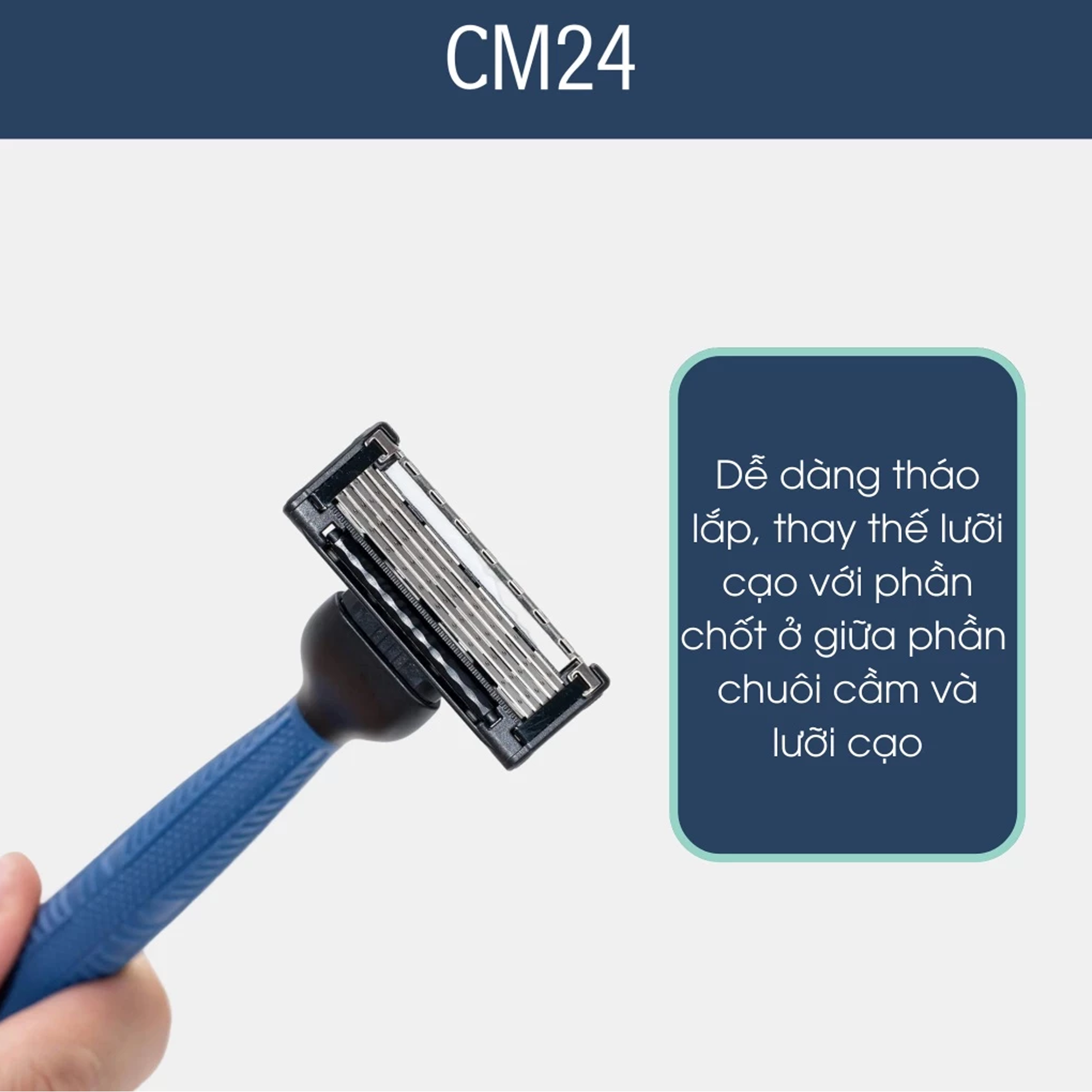 – Kết hợp cùng với đó là phần lược chải được sản xuất từ chất liệu cao su mềm mại. Mọi thao tác cạo râu của các chàng sẽ trở nên đơn giản hơn bao giờ hết với thiết kế tiện lợi của bộ lưỡi dao cạo râu CM24.
