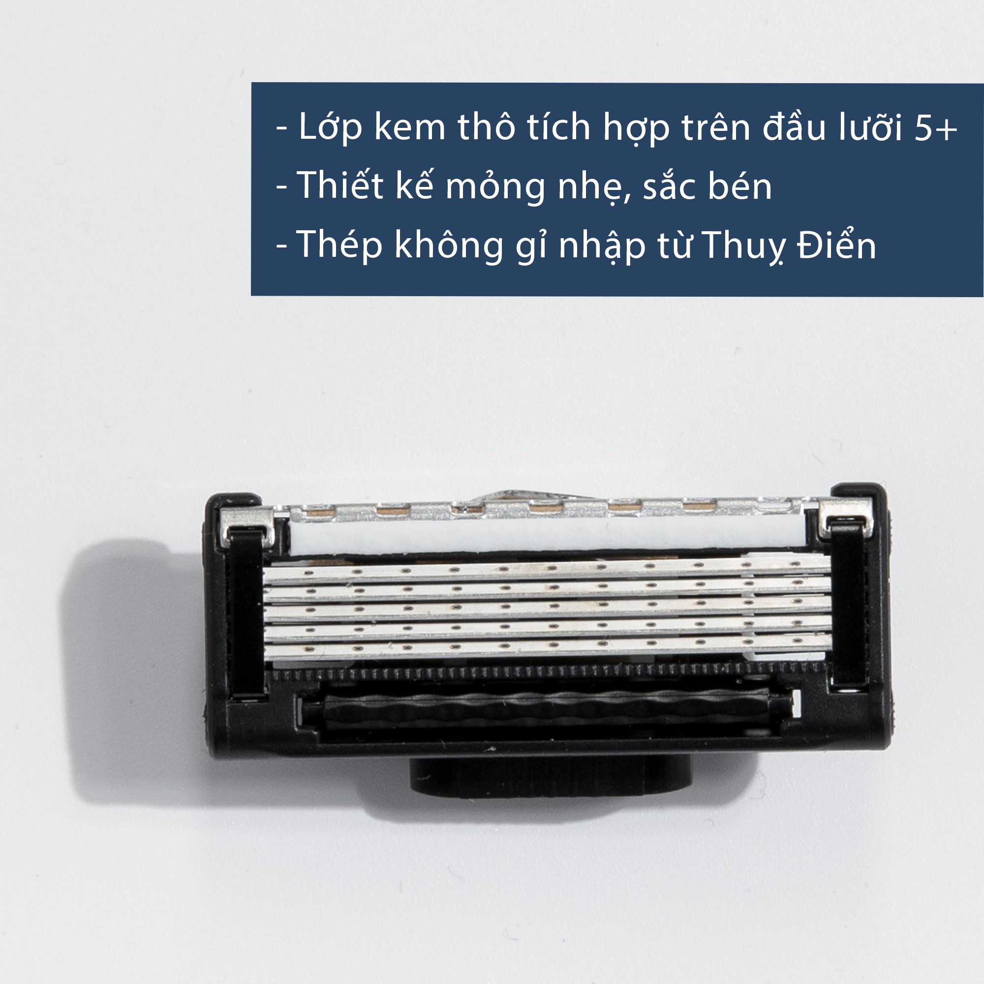 - Điểm nổi bật: - Bộ 2 Lưỡi dao cạo râu CM24 5 Lưỡi + 1: là 5 lưỡi nhỏ sắc bén kèm 1 lưỡi tỉa được sản xuất bằng thép không gỉ của Thuỵ Điển, phủ Platin, Crom và Glide-polymer.