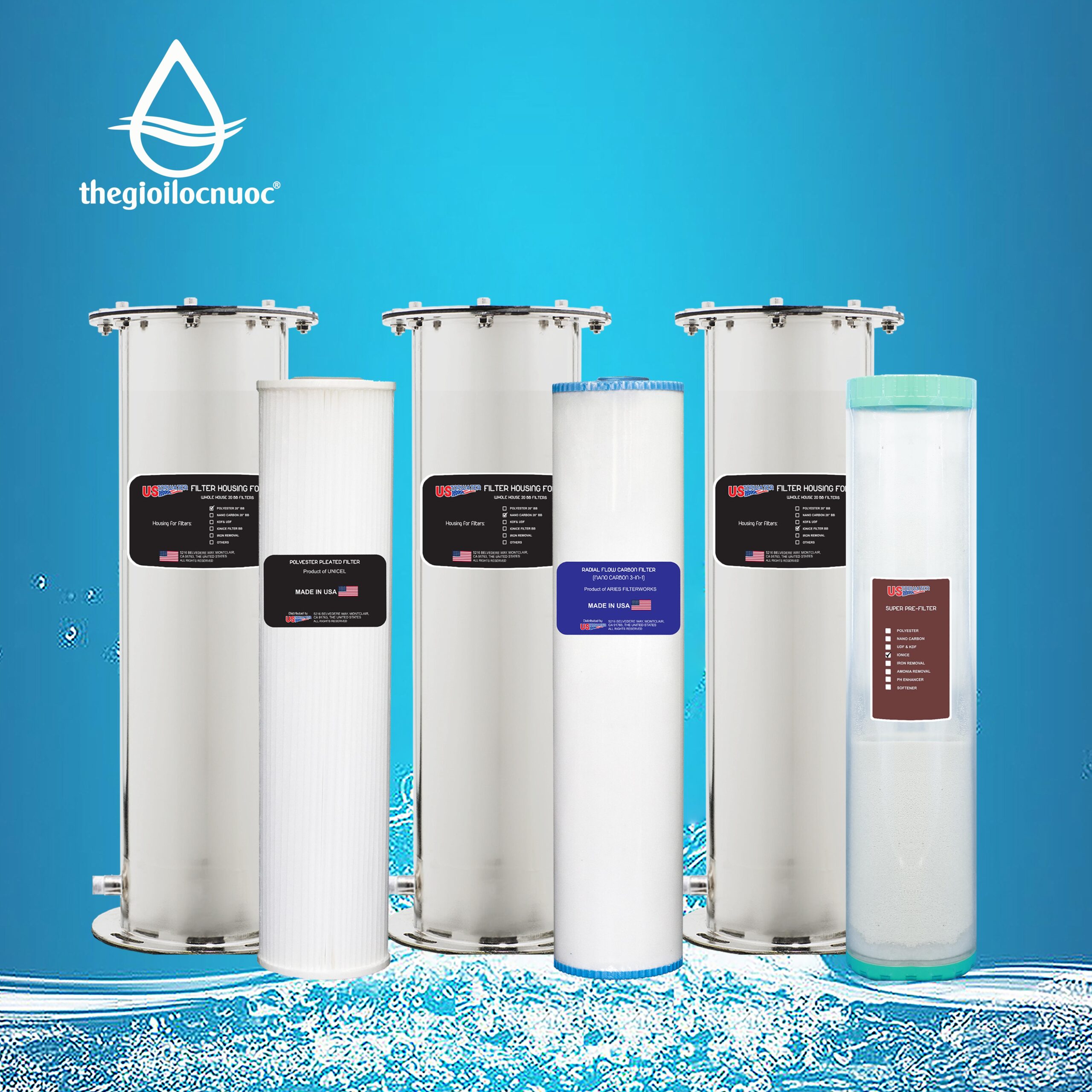 Hệ thống lọc tổng Mỹ dùng mô hình lõi lọc chính hãng đóng sẵn, hiệu suất lọc cao hơn và tích hợp nhỏ gọn, không dùng hạt lọc rời như các bộ lọc tổng thông thường đã làm thay đổi hoàn toàn ngành lọc tổng nước Mỹ. Nay công nghệ này đã có mặt tại Việt Nam. Chúng tôi tự hào mang đến cho bạn các bộ lọc chính hãng từ các thương hiệu hàng đầu thế giới gồm: USTopWater Inc (USA), UNICEL (USA), Aries (USA), Hydronix (USA), Claire Technologies (USA). Lọc Tổng Mỹ là hệ thống lọc tổng nước máy sử dụng rộng rãi cho nhà riêng, biệt thự, chung cư, nhà máy, trang trại…