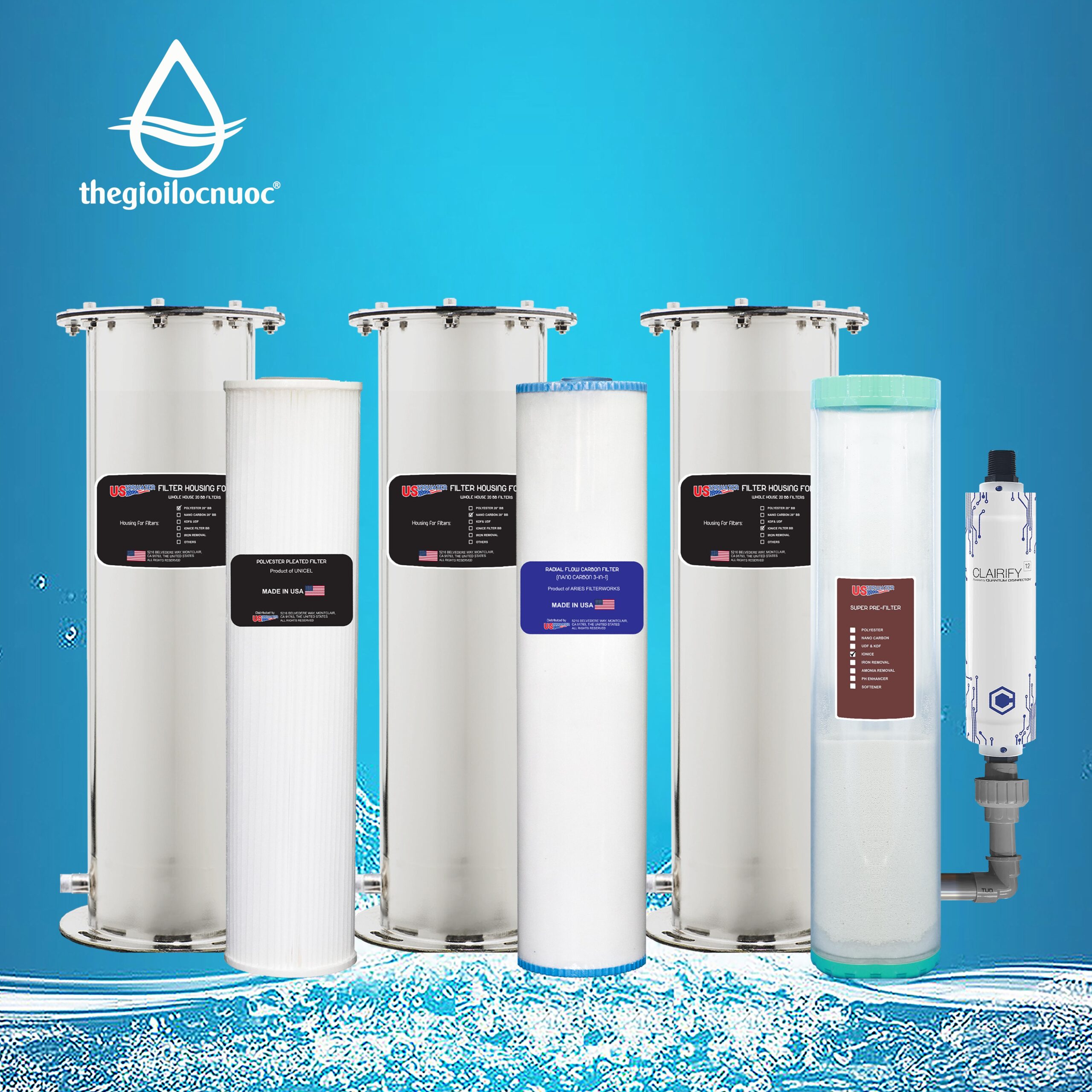 Hệ thống lọc tổng Mỹ dùng mô hình lõi lọc chính hãng đóng sẵn, hiệu suất lọc cao hơn và tích hợp nhỏ gọn, không dùng hạt lọc rời như các bộ lọc tổng thông thường đã làm thay đổi hoàn toàn ngành lọc tổng nước Mỹ. Nay công nghệ này đã có mặt tại Việt Nam. Chúng tôi tự hào mang đến cho bạn các bộ lọc chính hãng từ các thương hiệu hàng đầu thế giới gồm: USTopWater Inc (USA), UNICEL (USA), Aries (USA), Hydronix (USA), Quantum Disinfection (Canada). Lọc Tổng Mỹ là hệ thống lọc tổng nước máy sử dụng rộng rãi cho nhà riêng, biệt thự, chung cư, nhà máy, trang trại…