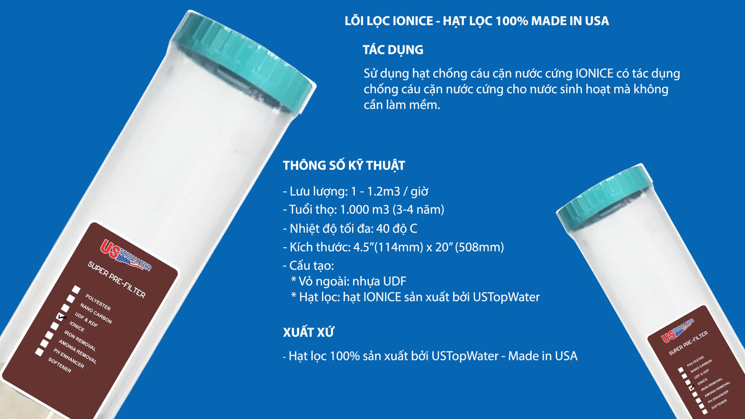 Lõi lọc IONICE sử dụng hạt chống cáu cặn IONICE được sản xuất tại Mỹ bởi USTOPWATER. Hạt chống cáu cặn sử dụng công nghệ chống cáu cặn nước cứng mà không cần làm mềm.