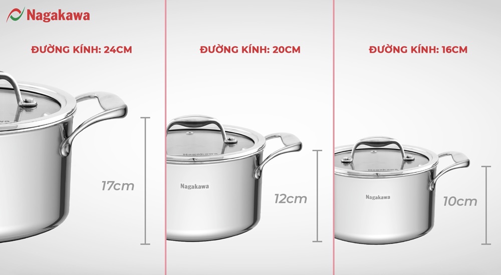 Bộ nồi inox NAG1355 gồm 3 kích cỡ: 16,20,24cm, đáp ứng đa dạng nhu cầu nấu nướng từ các món kho, luộc, nấu… cho gia đình từ 2-6 người, phù hợp với đa số gia đình. Đồng thời, Bộ nồi inox NAG1355 có thể được sử dụng được trên mọi loại bếp như: bếp từ, bếp gas, bếp điện,… tiện lợi trong sử dụng.