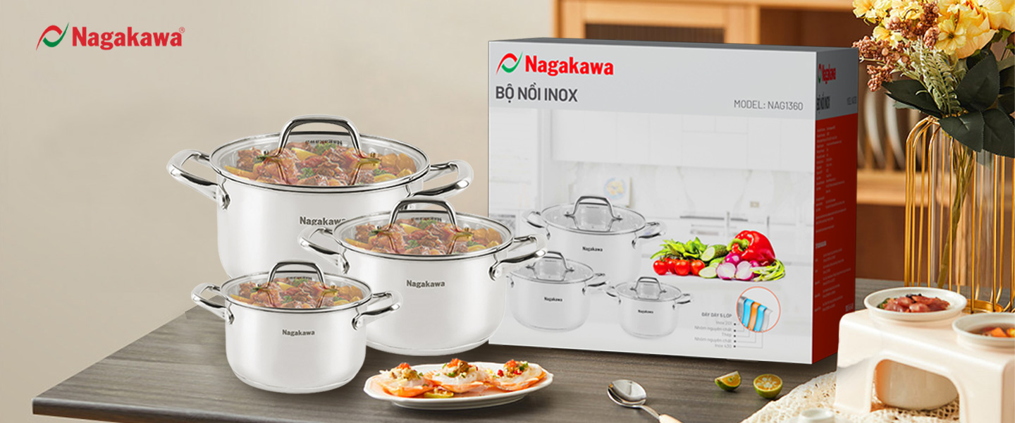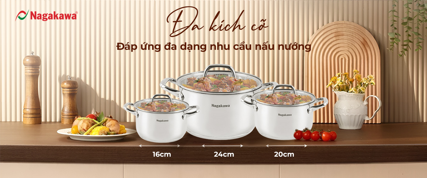 - Bộ nồi inox Nagakawa NAG1360 bao gồm 3 nồi có đường kính 16cm, 20cm và 24cm phù hợp với đa dạng nhu cầu nấu nướng cùng lúc trong bữa ăn, nhờ đó tiết kiệm thời gian và nhiên liệu tối đa, đồng thời tối ưu hóa quá trình nấu nướng và thỏa mãn mọi khẩu vị.