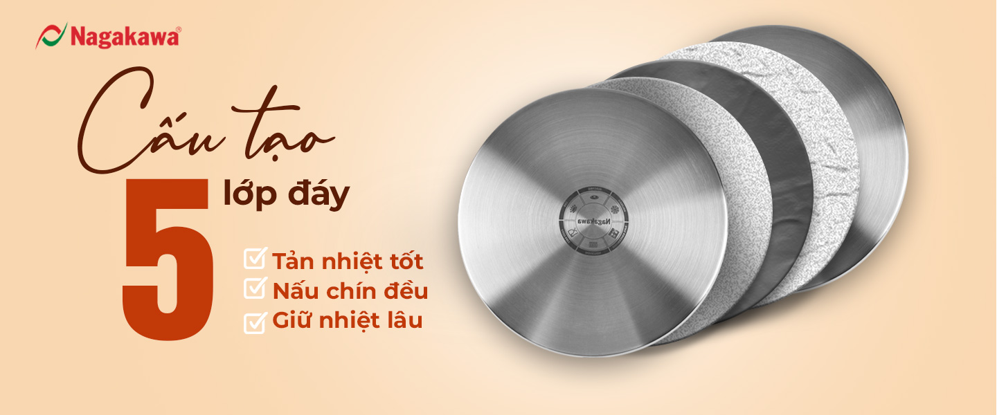 Với thiết kế đáy 5 lớp giúp nhiệt lượng được gia tăng, độ ổn định nhiệt cao, phân phối nhiệt lượng đều từ dưới đáy nồi lên trên, đảm bảo rằng thực phẩm nấu chín từ mọi phía giúp cho thức ăn trọn vị ngon. Ngoài ra, khả năng giữ nhiệt lâu giúp thực phẩm được duy trì ở nhiệt độ ổn định sau khi nấu, giữ cho món ăn ấm áp và ngon miệng khi được thưởng thức. Nhờ đó, công việc nấu nướng của chị em nội trợ trở nên dễ dàng, mang lại những bữa ăn ngon miệng cho gia đình