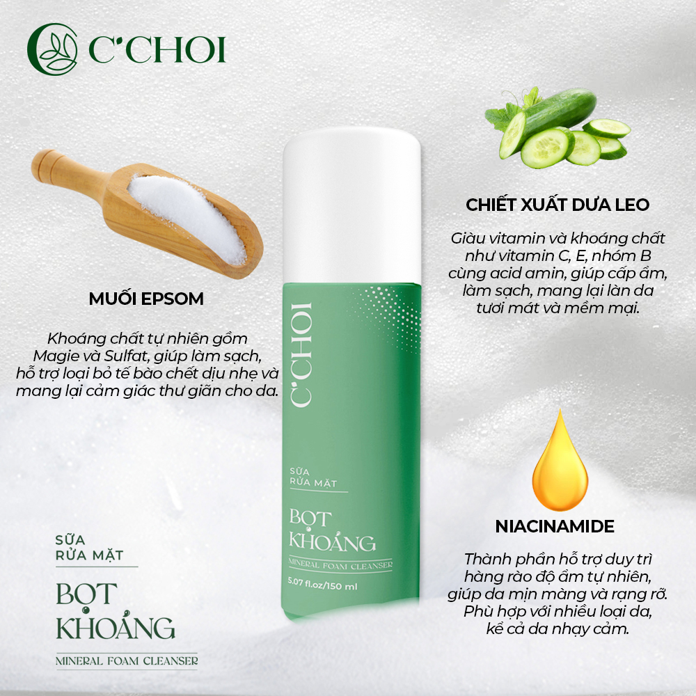 - Với kết cấu bọt mịn cùng khoáng chất từ muối Epsom, chiết xuất dưa leo và Niacinamide, sản phẩm giúp làm sạch nhẹ nhàng, mang lại làn da thoáng mát sau khi rửa.