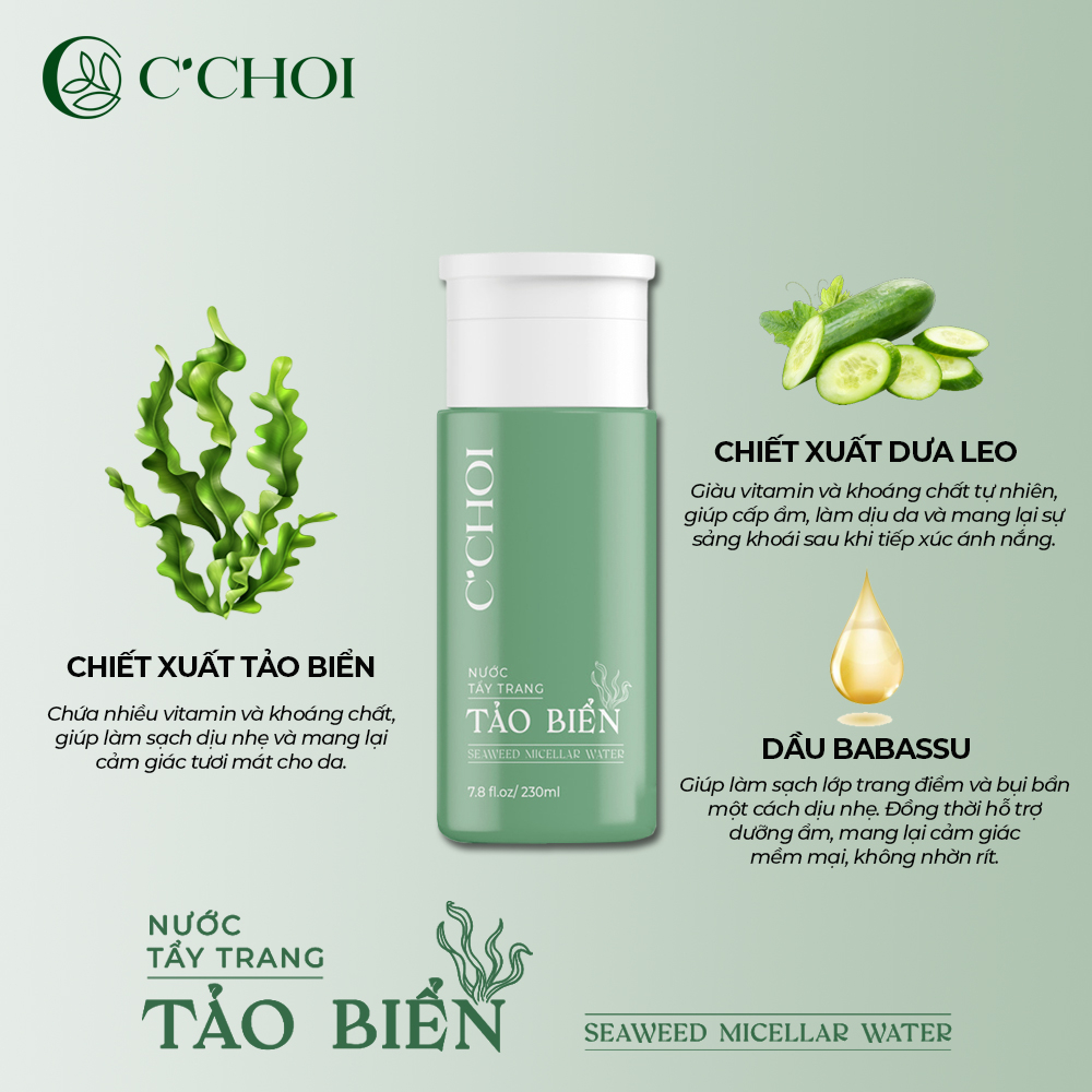 - BỘ SẢN PHẨM LÀM SẠCH DA (Nước Tẩy Trang Tảo Biển – Seaweed Micellar Water & Sữa Rửa Mặt Bọt Khoáng – Mineral Foam Cleanser)Bộ sản phẩm làm sạch da từ Mỹ phẩm xanh C’Choi mang đến giải pháp chăm sóc da cơ bản mỗi ngày, giúp làm sạch bụi bẩn, lớp trang điểm và mang lại cảm giác thoáng mát, dễ chịu sau khi sử dụng.