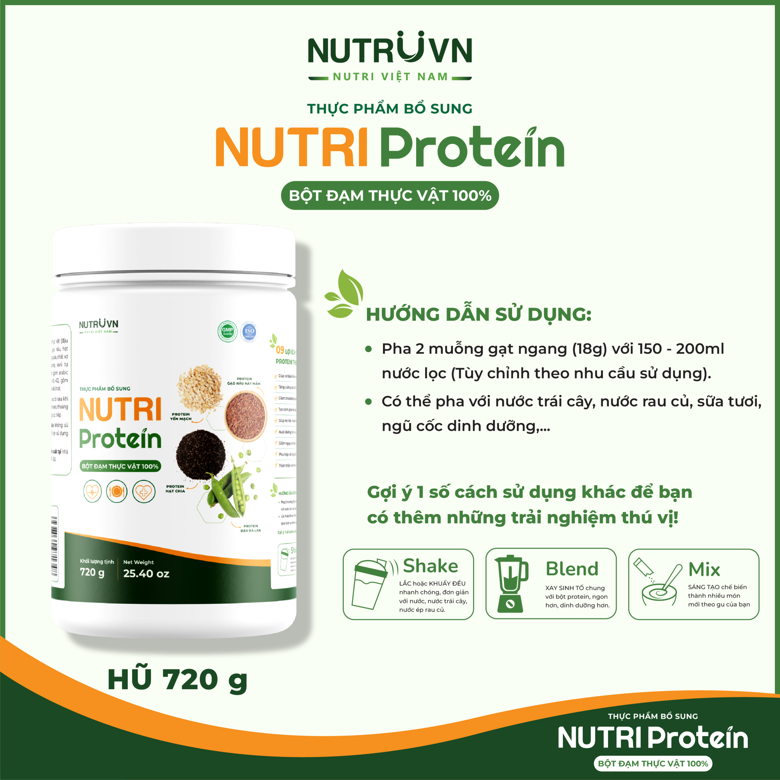 - Nutri Protein với công thức gồm các thành phần tự nhiên, là nguồn cung cấp protein thực vật thiết yếu cho cơ thể, giúp cơ bắp khỏe mạnh, hỗ trợ vóc dáng.