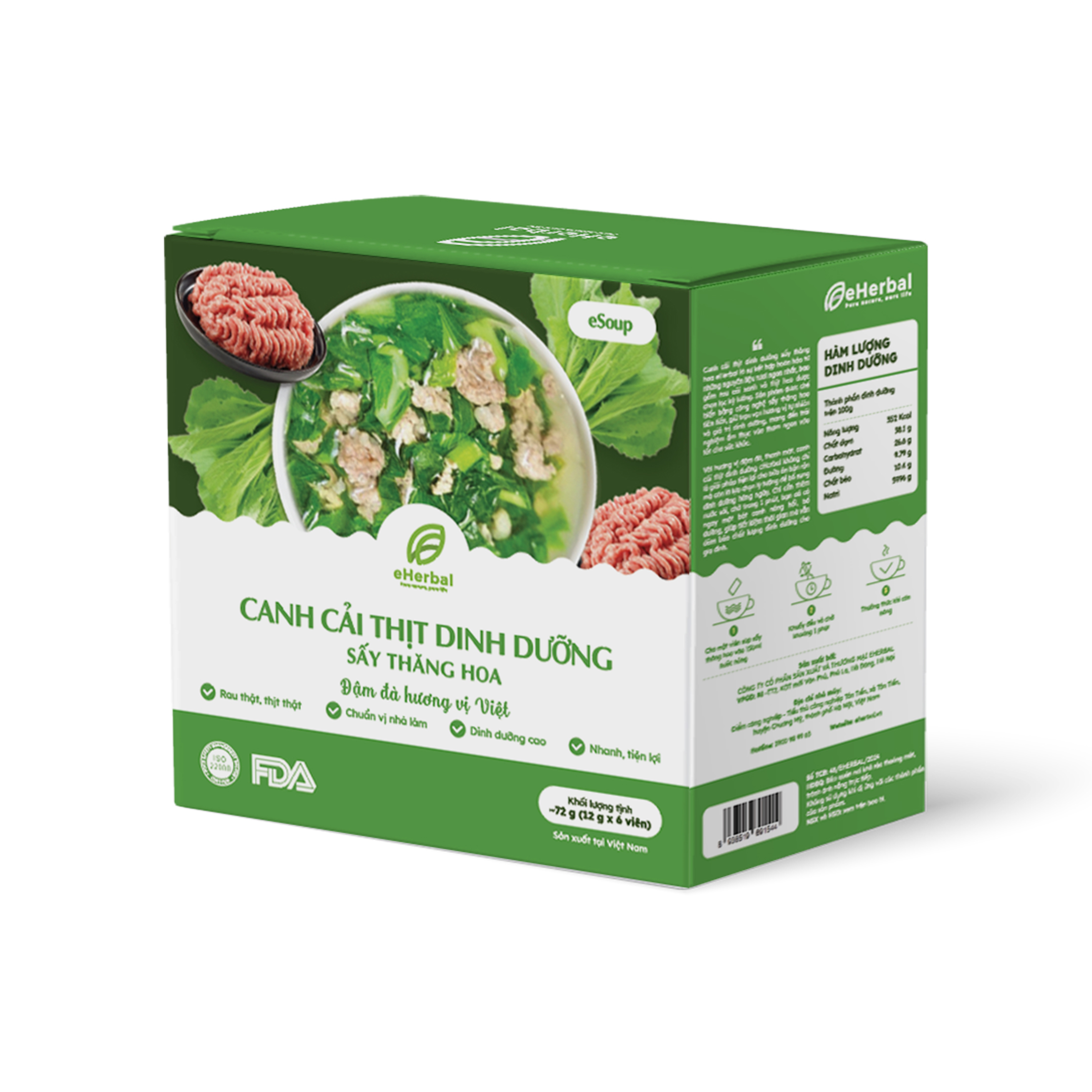 - Canh cải thịt sấy thăng hoa eHerbal được chế biến từ những nguyên liệu tươi ngon nhất, bao gồm cải và thịt heo, lựa chọn kỹ lưỡng và áp dụng công nghệ sấy thăng hoa hiện đại.