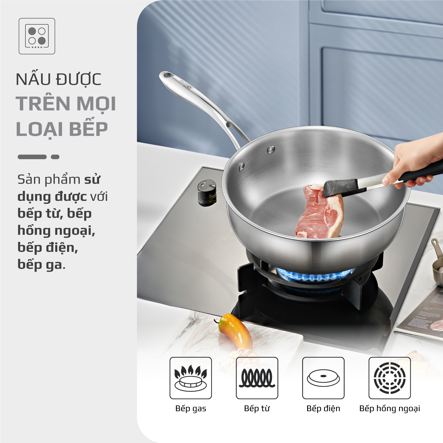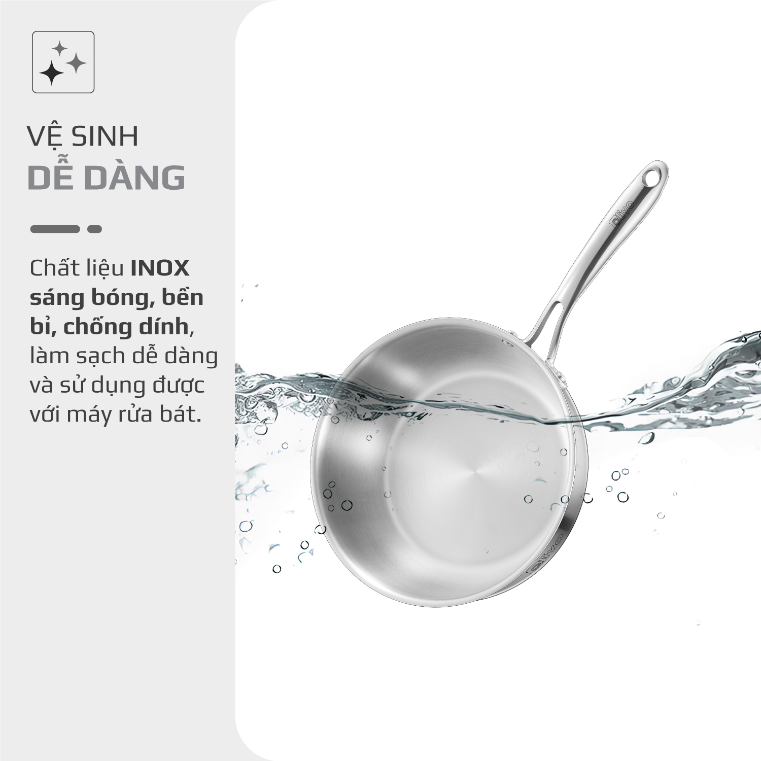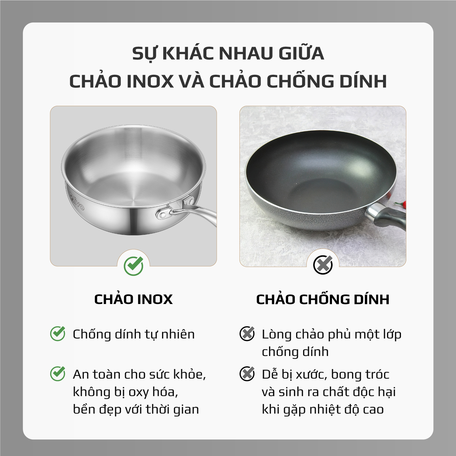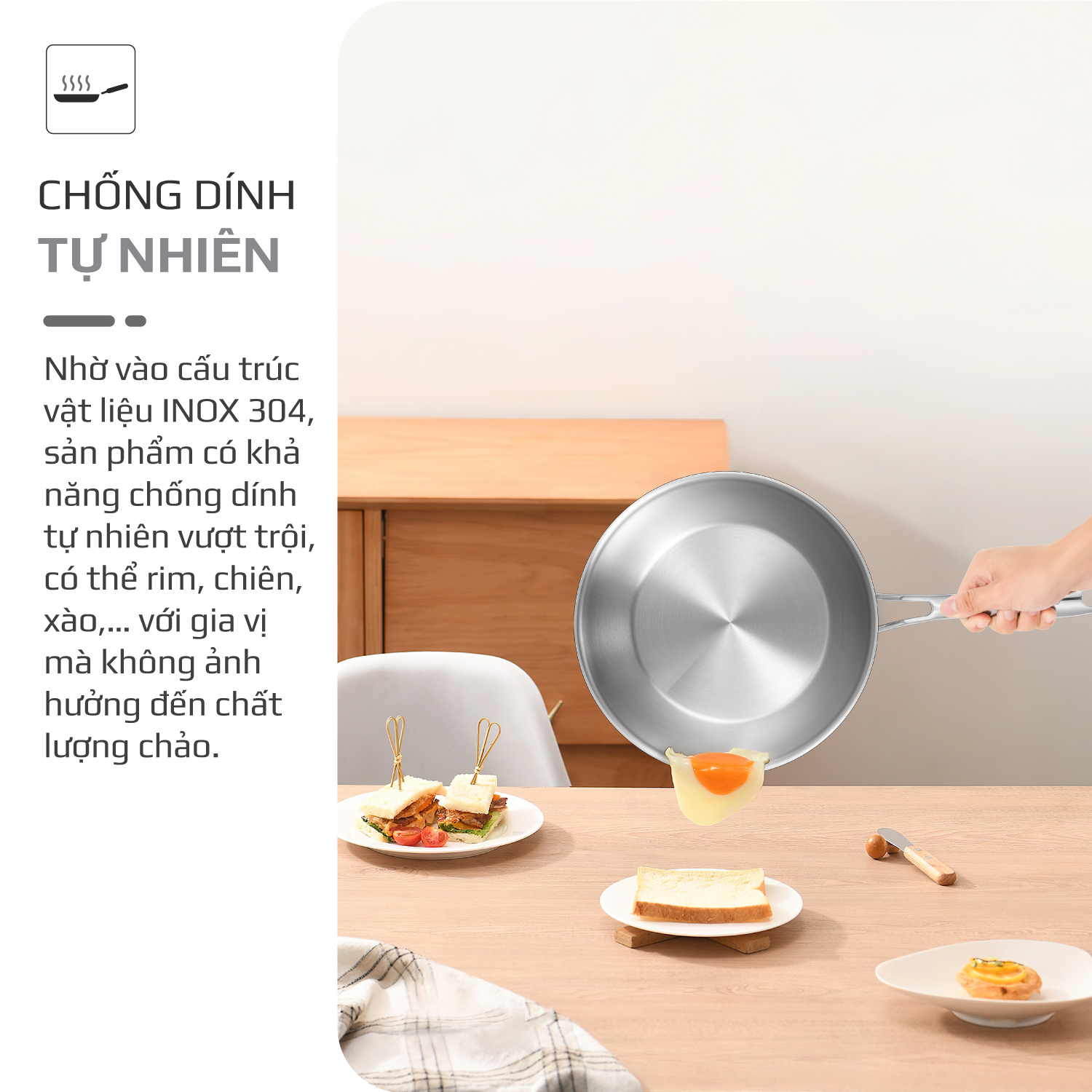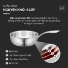 - Lòng chảo chất liệu INOX 304 có khả năng chống dính tự nhiên khi đã hấp thụ đủ nhiệt là ưu điểm nổi bật của loại chảo này.