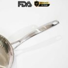 - Đáy liền nguyên khối dễ vệ sinh và bền bỉ; tay cầm khoen hở inox chắc tay, an toàn khi thao tác—phù hợp cho căn bếp hiện đại.