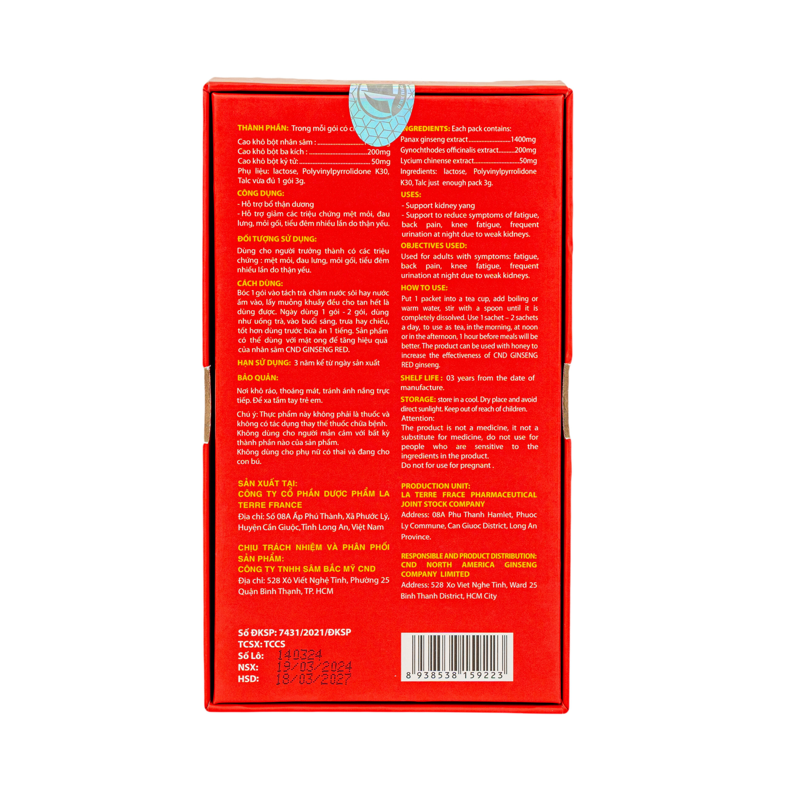 - Thành PhầnCao khô bột nhân sâm: 1400mgCao khô bột ba kích: 200mgCao khô bột kỷ tử: 50mgPhụ liệu: lactose, Polyvinylpyrrolidone K30, Tacl vừa đủ 1 gói 3gTá dược vừa đủ 3g2.
