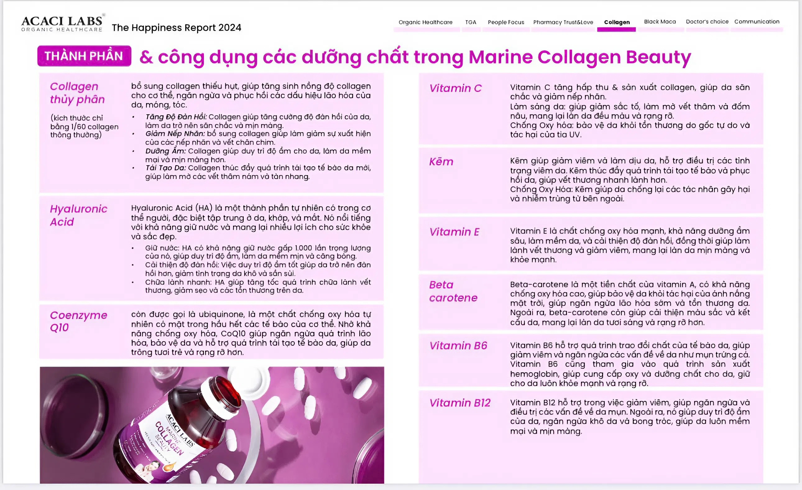 - Thành phần chính của collagen thủy phân Acaci Labs Úc: hàm lượng tương ứng với liều dùng 3 viên nén:THÀNH PHẦNHÀM LƯỢNG Collagen thủy phân1500 mgVitamin C (axit ascorbic) (từ Calcium ascorbate dehydrate 37,262 mg)90 mgKẽm (Oxit kẽm 6,414 mg) 15 mgPyridoxine (Vitamin B6) (từ Pyridoxine hydrochloride 0,605 mg)1,5 mgCyanocobalamin (Vitamin B12)20,001 mcgUbidecarenone (Coenzyme Q10)15 mgD-alpha-tocopherol (Vitamin E) (từ D-alpha-tocopheryl acid succinate 2,75 mg) 9,99 IUNatri hyaluronate9 mgBetacarotene1,2 mg Phụ liệu: Chất tạo màu tổng hợp (Allura red AC aluminium lake-INS 129; Indigo carmine aluminium lake-INS 132, Titanium dioxide-INS 171); chất chống đông vón (Magie stearate-INS470(iii); Manitol-INS 421; Cellulose vi tinh thể-INS 460 (i); Canxi hydro photphat dihydrat-INS341(ii); Sáp Carnauba-INS 903; Silica khan dạng keo INS 552); Chất làm rã (Natri croscarmellose; Crospovidone); Macrogol 3350; Polyvinyl alcohol; Purified talc; Povidone 3.