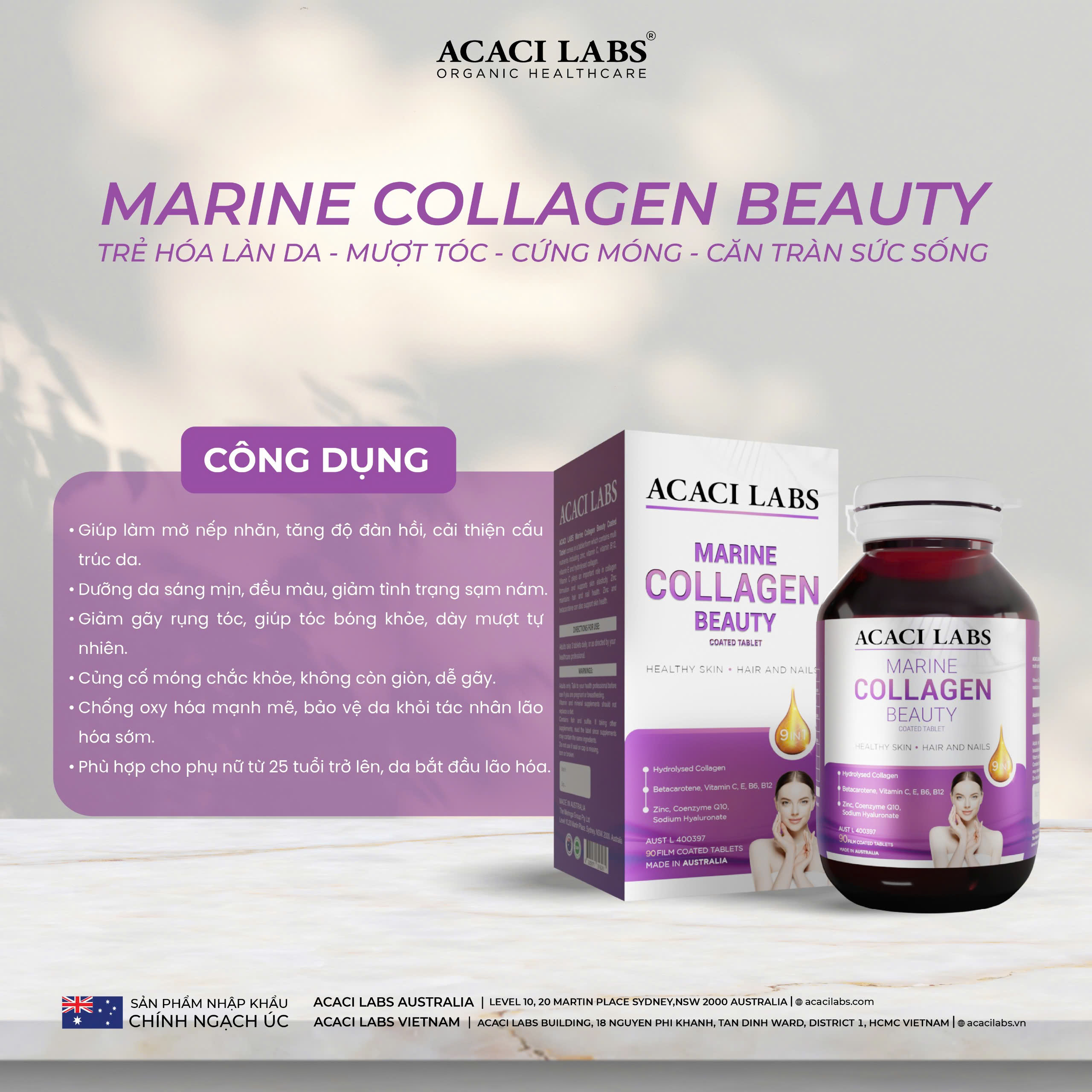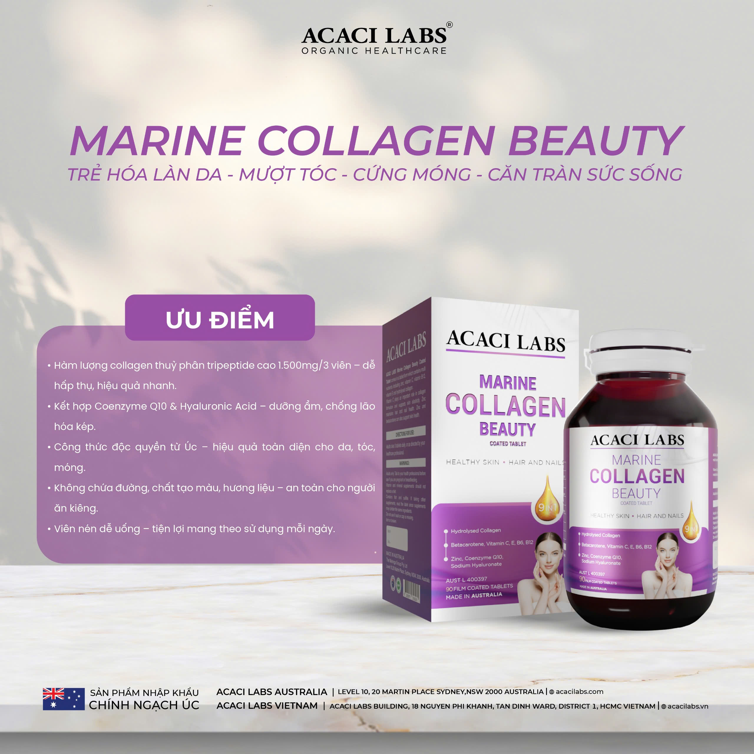 • Tên sản phẩm: Viên uống collagen thủy phân hỗ trợ da móng tóc khỏe đẹp Acaci Labs Marine Collagen Beauty Australia (hộp 90 viên) 2.