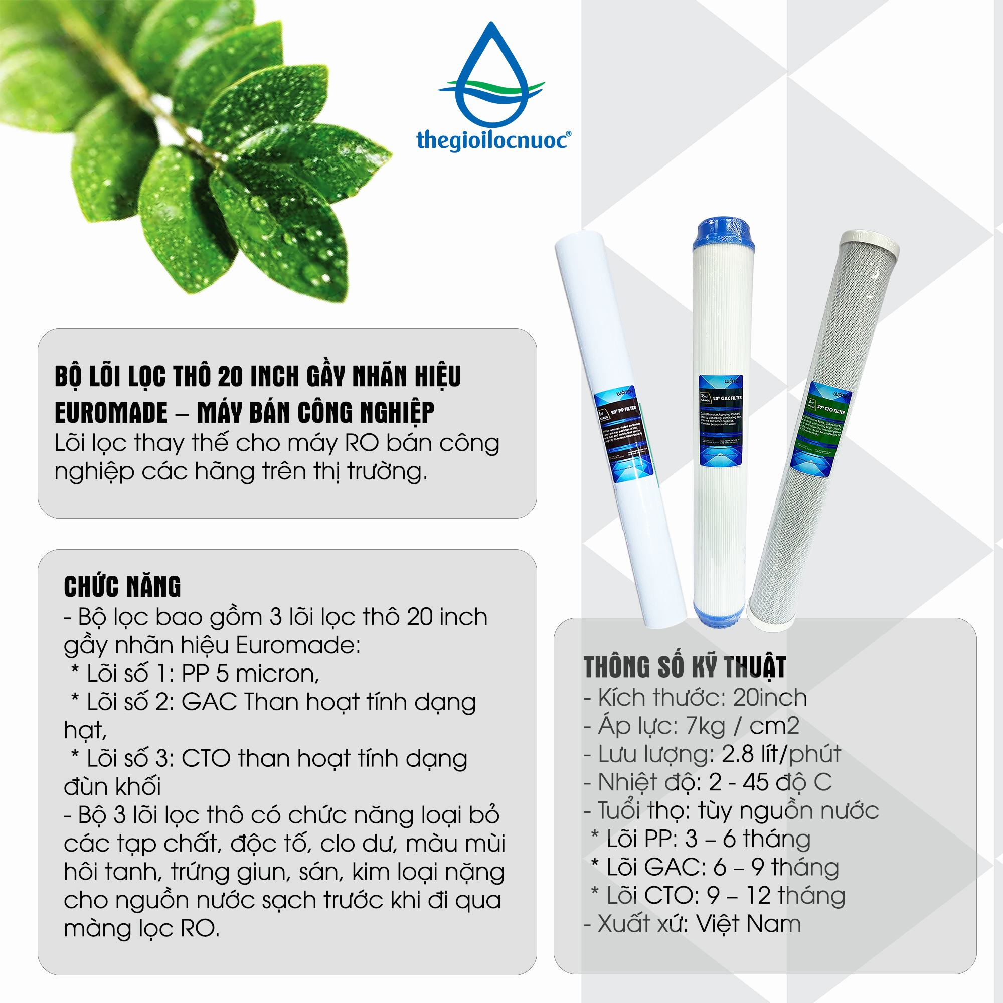 – Kích thước: 20inch gầy – Áp lực: 7kg / cm2 – Lưu lượng: 2.8 lít/phút – Nhiệt độ: 2 – 45 độ C – Tuổi thọ: tùy nguồn nước * Lõi PP 3 – 6 tháng * Lõi GAC 6 – 9 tháng * Lõi CTO 9 – 12 tháng – Xuất xứ: Việt Nam