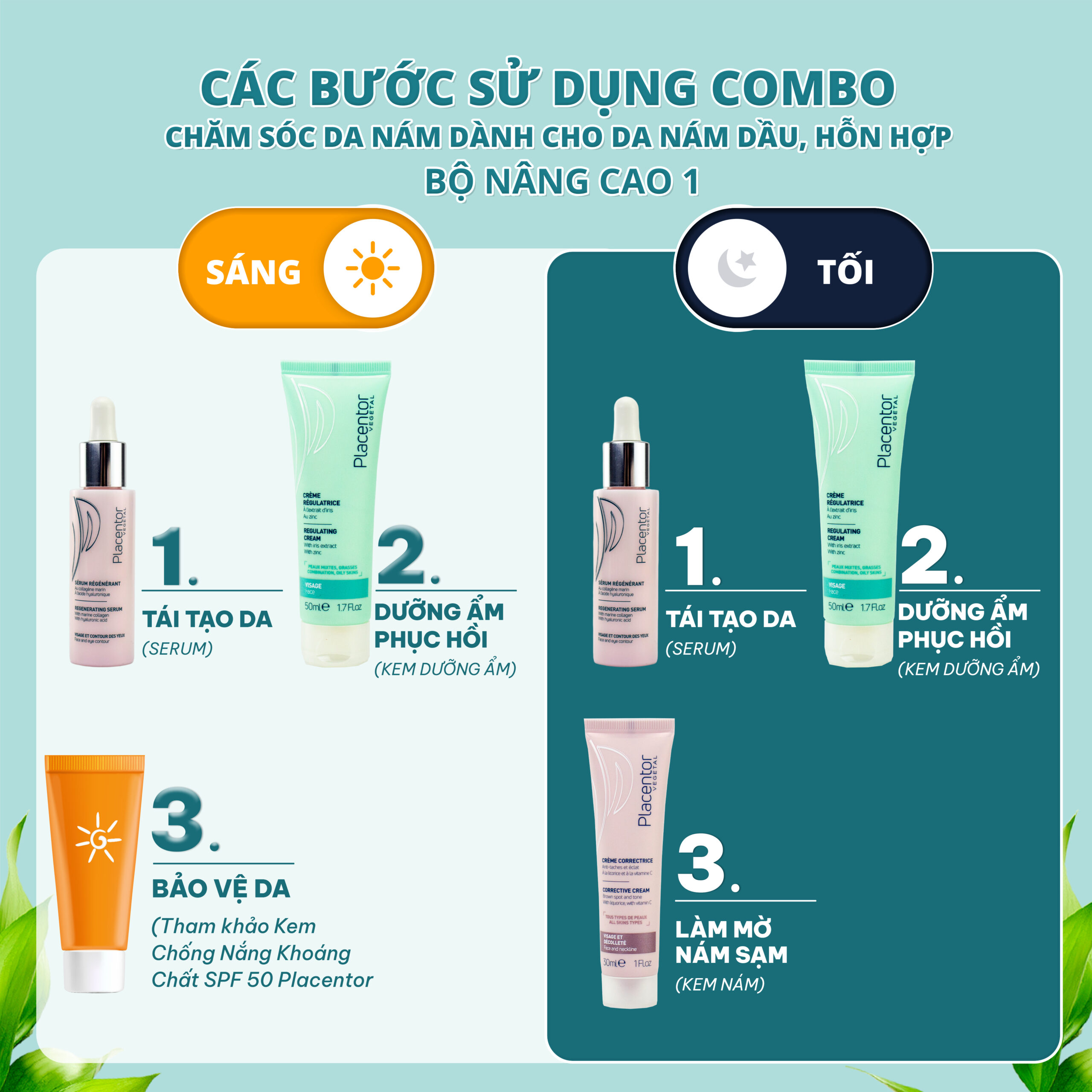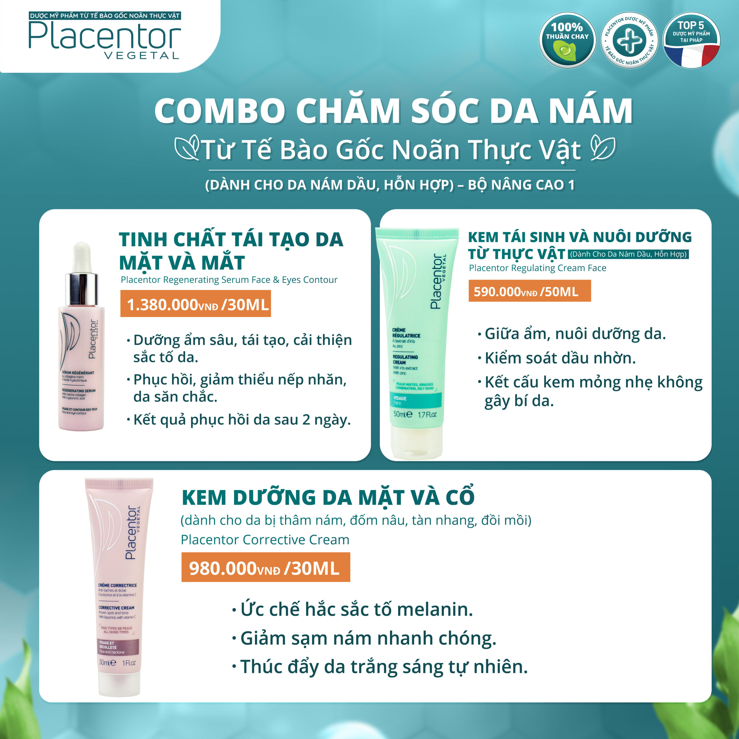 - Thành phần:Tinh chất tái tạo da mặt và mắt Placentor Regenerating Serum Face & Eyes Contour 30mlKem tái sinh và nuôi dưỡng (dành cho da dầu, da hỗn hợp) Placentor Regulating Cream Face 50mlKem dưỡng da mặt và cổ (dành cho da bị thâm nám, đốm nâu, tàn nhang, đồi mồi) Placentor Corrective Cream 30ml5.