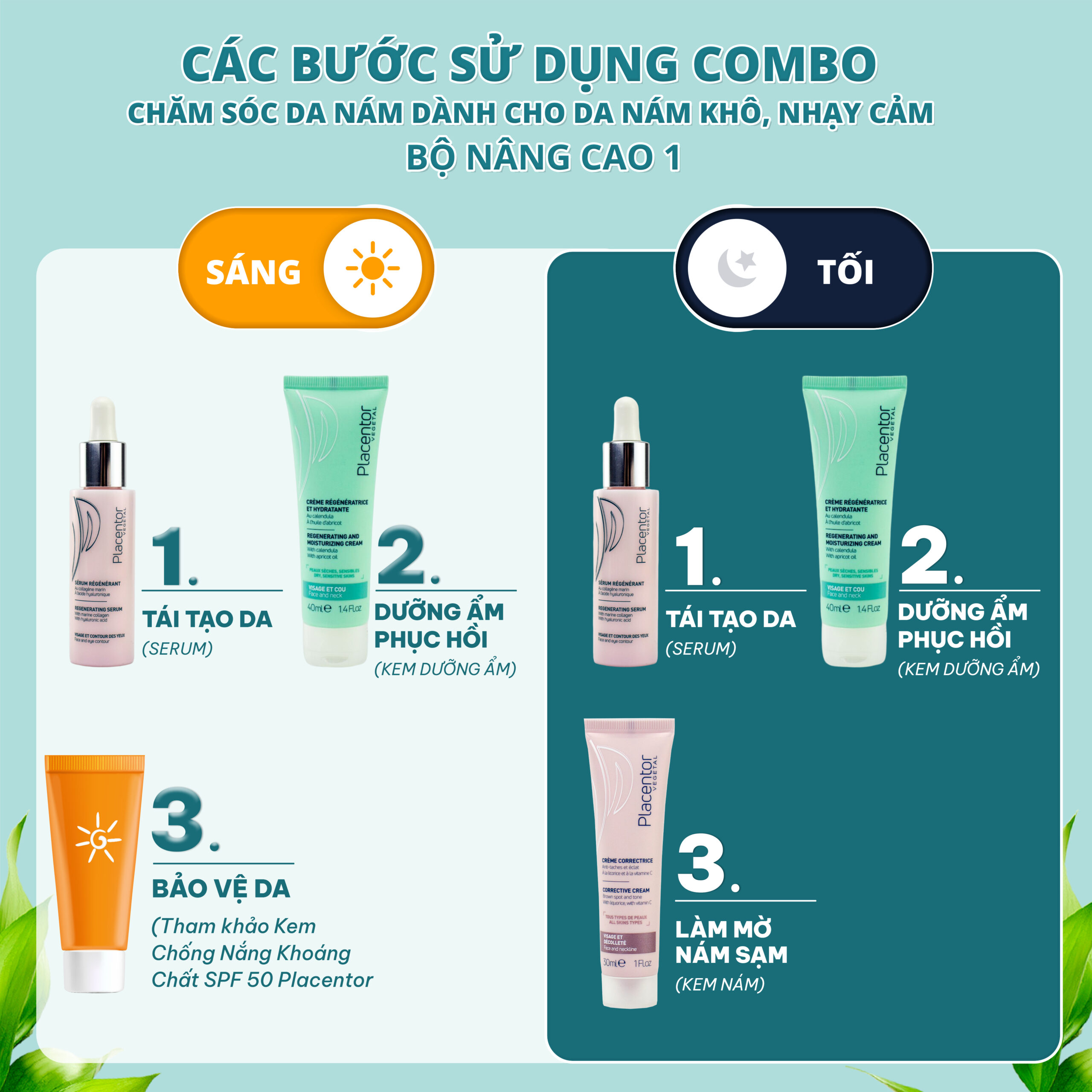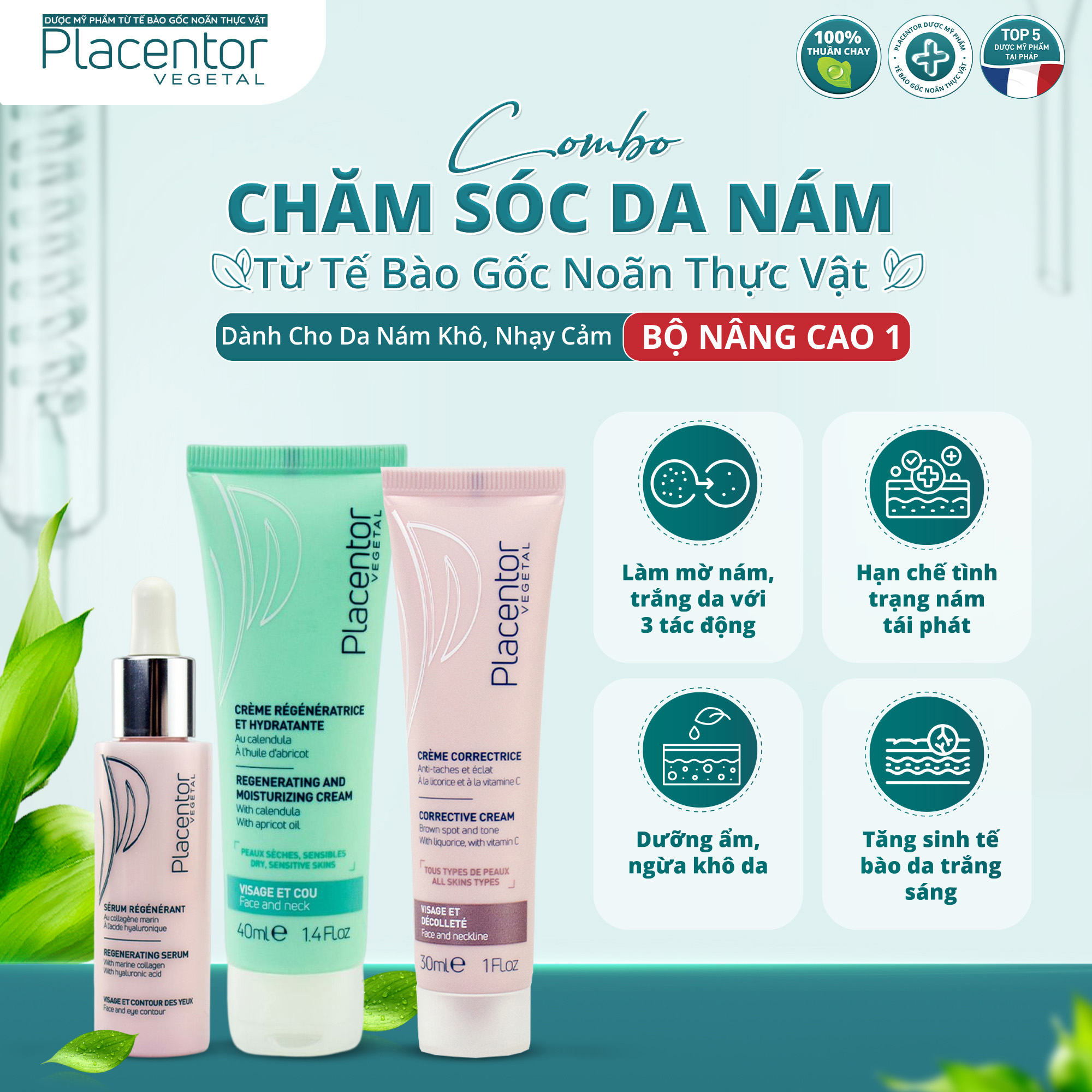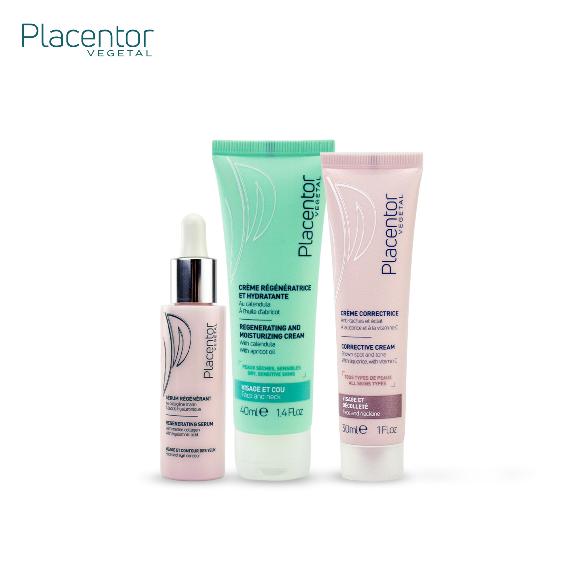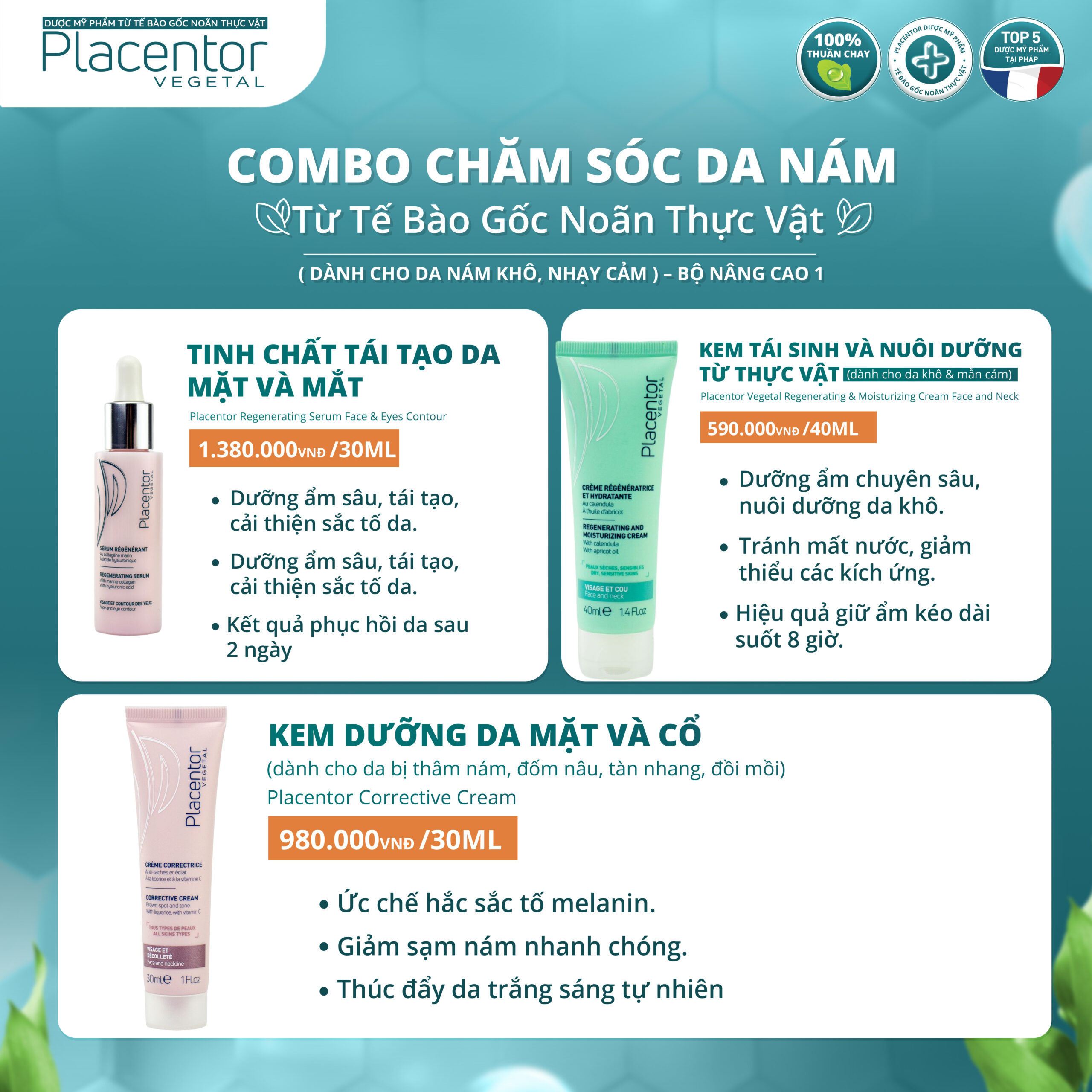 - Thành phần:Tinh chất tái tạo da mặt và mắt Placentor Regenerating Serum Face & Eyes Contour 30mlKem tái sinh và nuôi dưỡng từ thực vật (dành cho da khô & mẫn cảm) Placentor Vegetal Regenerating & Moisturizing Cream Face and Neck 40mlKem dưỡng da mặt và cổ (dành cho da bị thâm nám, đốm nâu, tàn nhang, đồi mồi) Placentor Corrective Cream 30ml5.