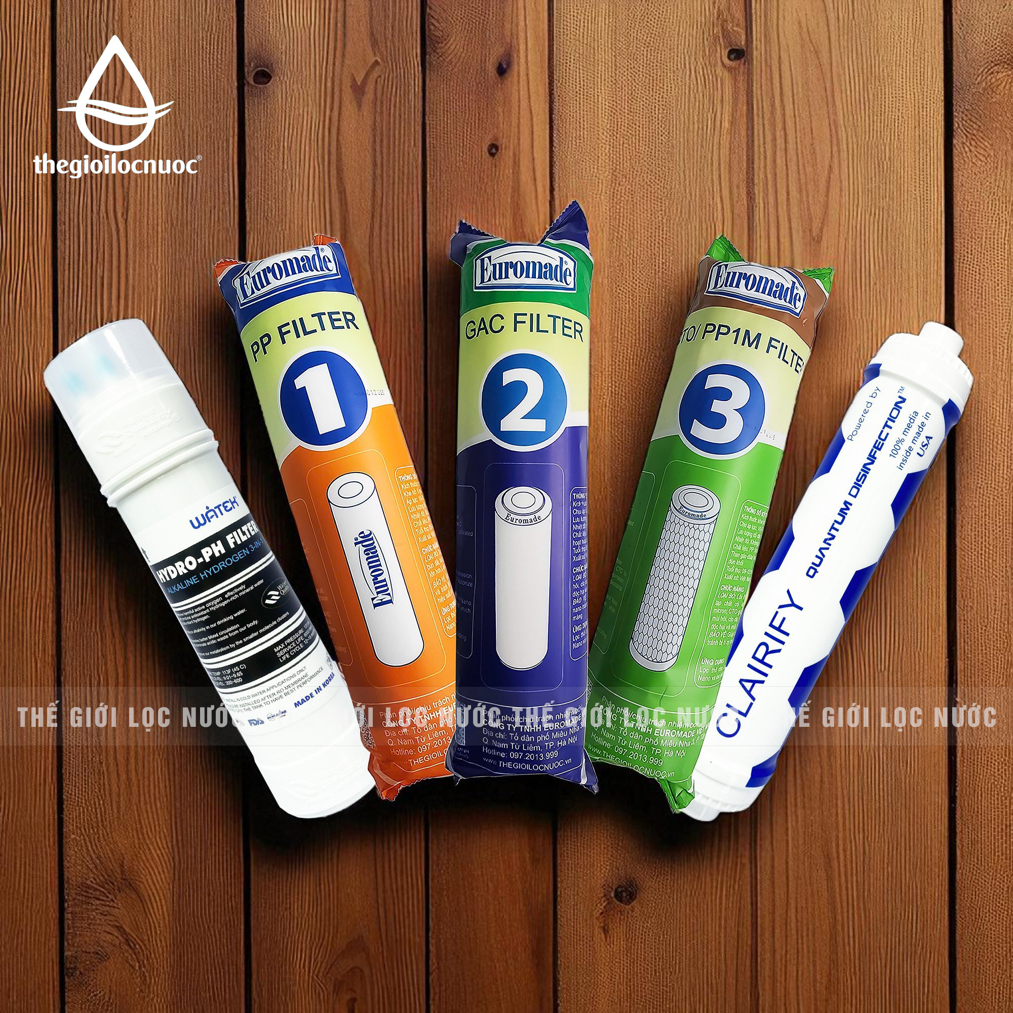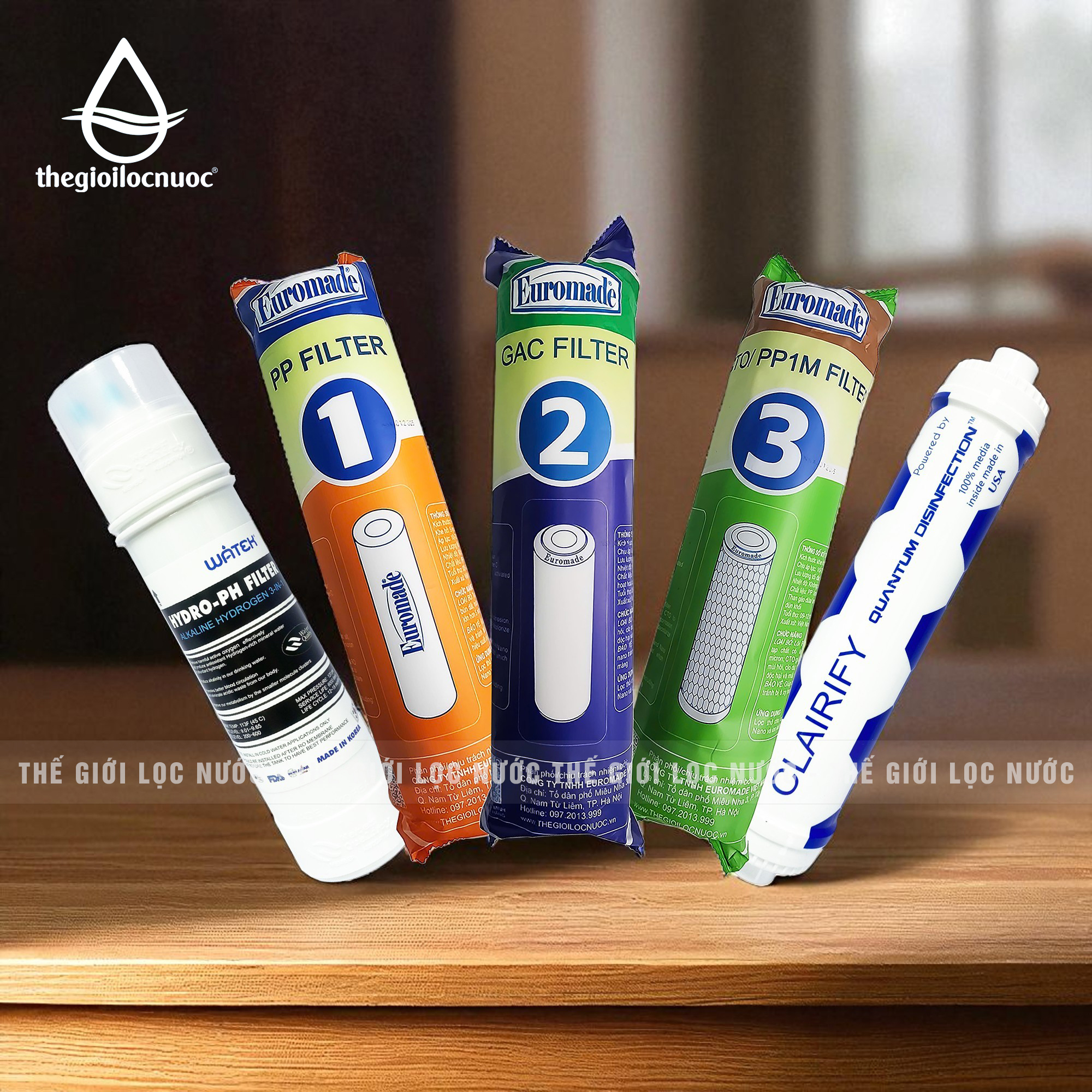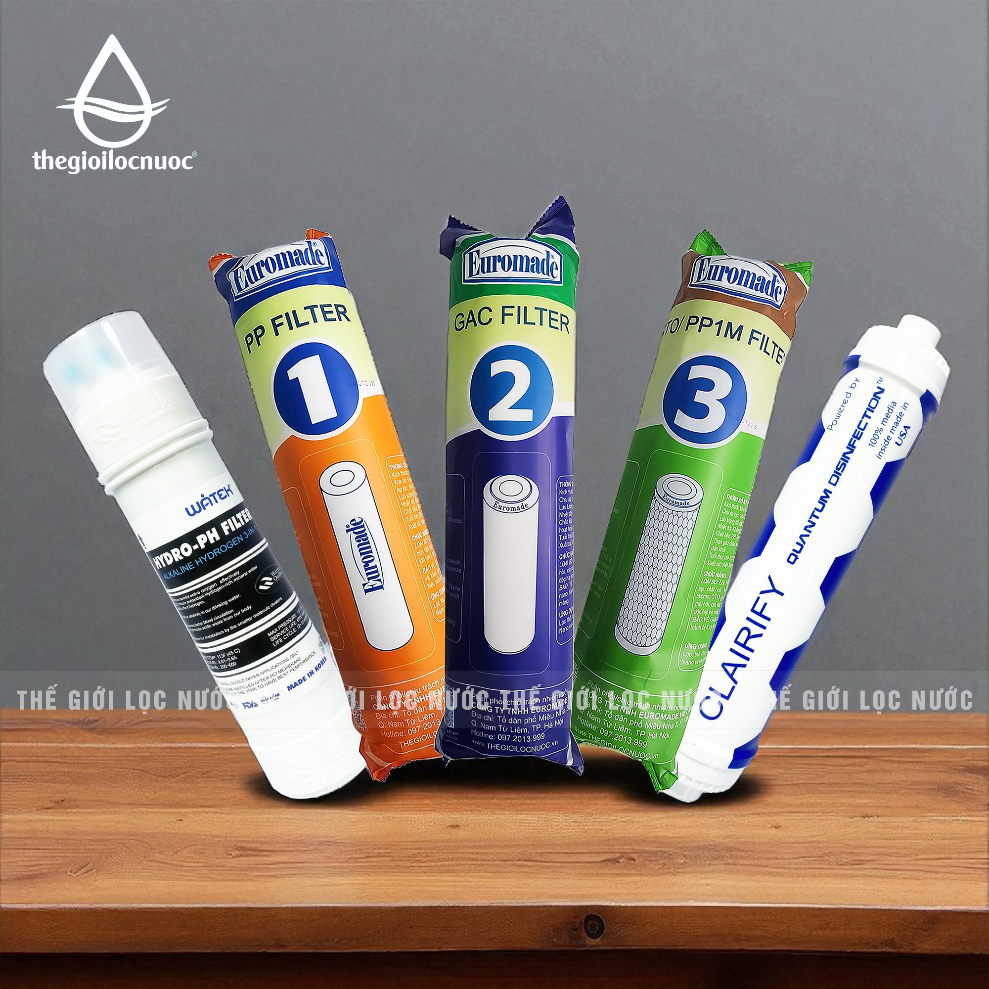 • Miễn phí nhân công thay thếTHÔNG SỐ KỸ THUẬT3 LÕI LỌC THÔ 1-2-3 NHÃN HIỆU EUROMADE- Kích thước: 10"- Áp lực: 10-70psi- Nhiệt độ: Không quá 40 độ C- Xuất xứ: Việt NamLÕI TẠO KIỀM HYDROGEN 3in1 (HYDRO-PH FILTER)- Công suất: 120 lít/ h- Tuổi thọ: 6000 lít- Nhiệt độ tối đa: 45 độ C- Xuất xứ: Hàn Quốc- Chứng nhận WQA – Hoa Kỳ (in dập nổi)LÕI LỌC DIỆT KHUẨN LƯỢNG TỬ - QUANTUM DISINFECTION- Công suất: 120 lít/ h- Tuổi thọ: 60 tháng (19.
