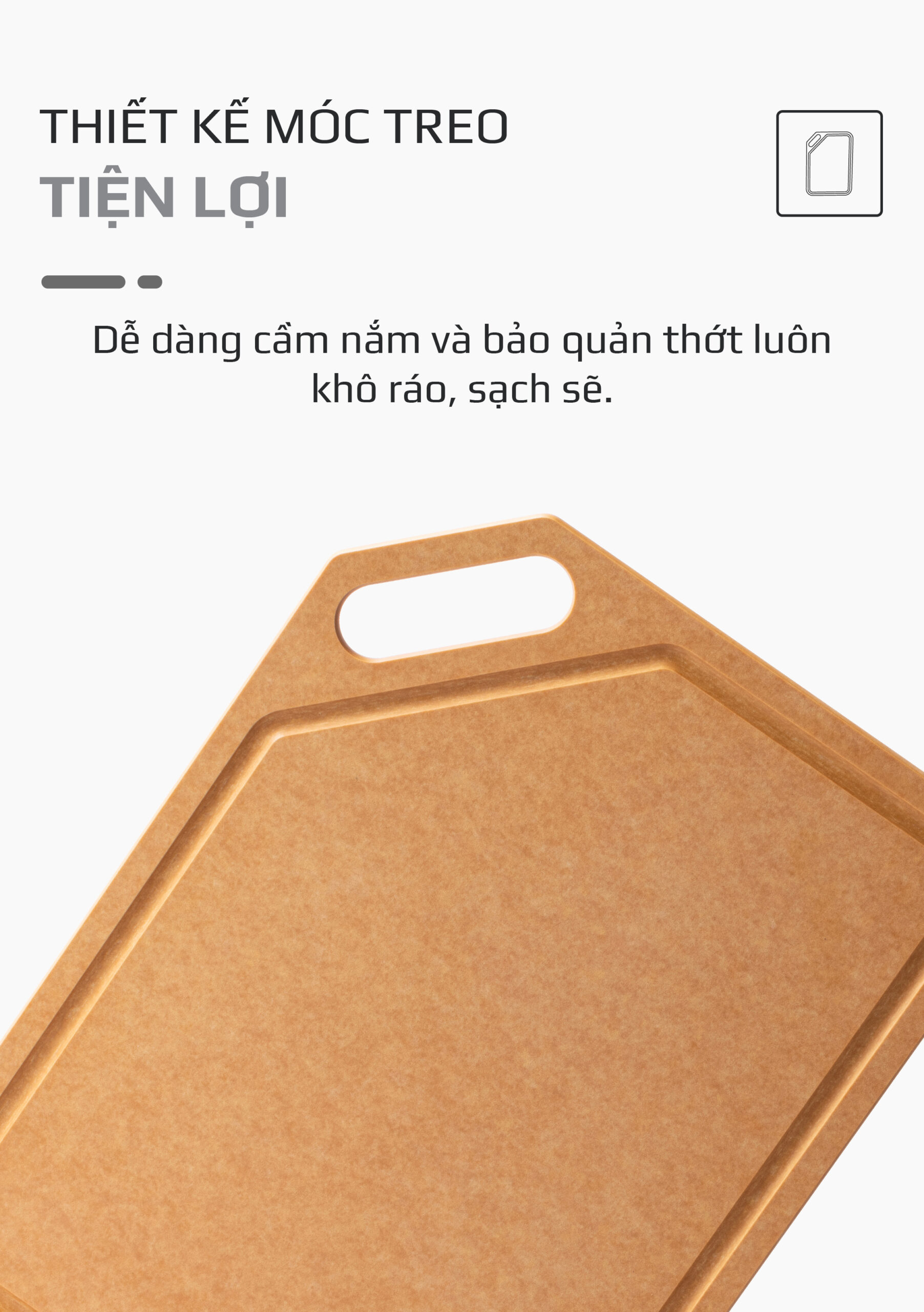 - Có móc treo tiện lợi giúp dễ dàng sử dụng và bảo quản thớt luôn khô ráo, sạch sẽ.