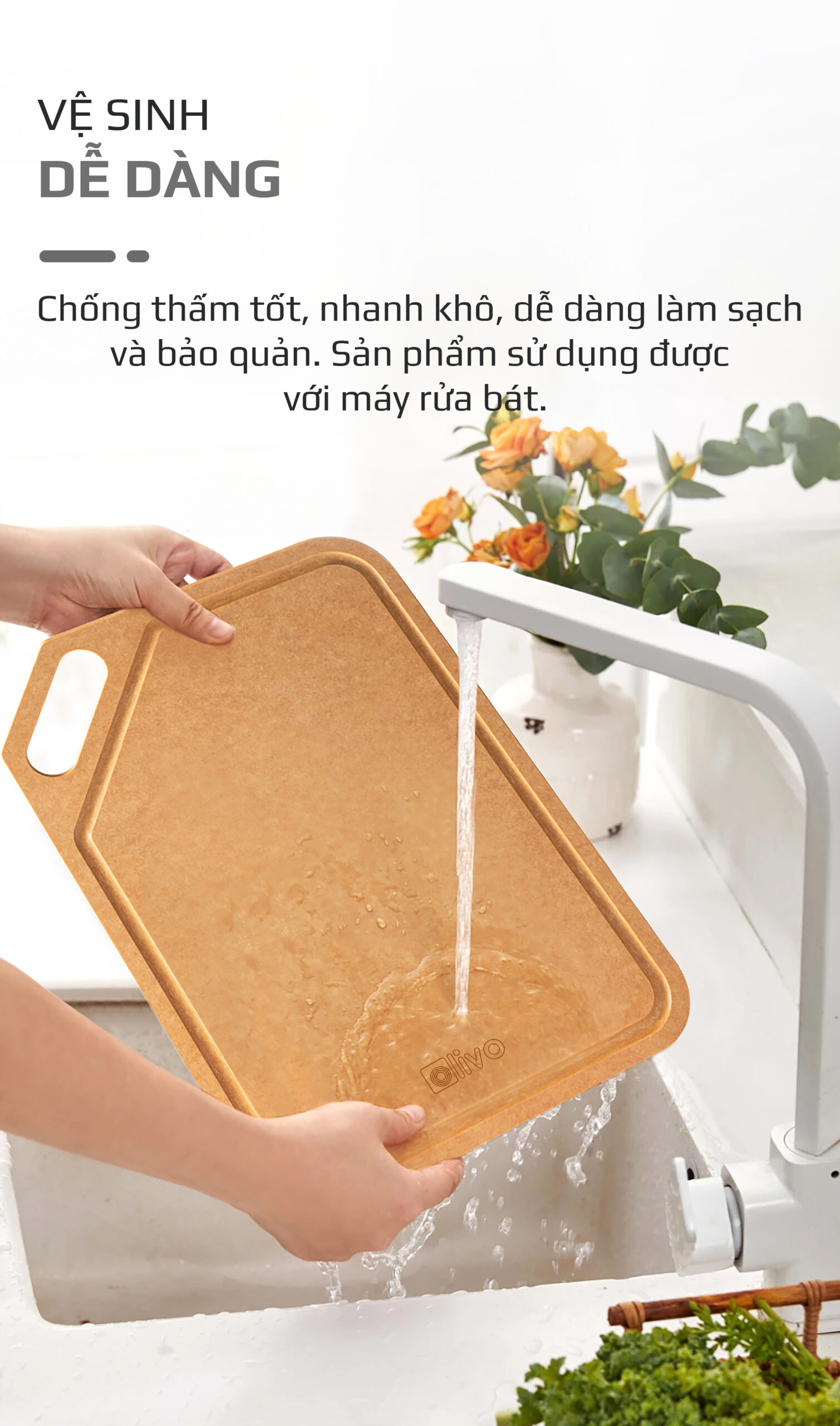 - Thớt làm từ chất liệu Wood Fiber – Sợi gỗ tự nhiên được ép chặt với áp lực 3000 tấn trong môi trường nhiệt độ và áp suất cao tạo nên chiếc thớt gỗ có độ cứng cáp và bền bỉ vượt trội.