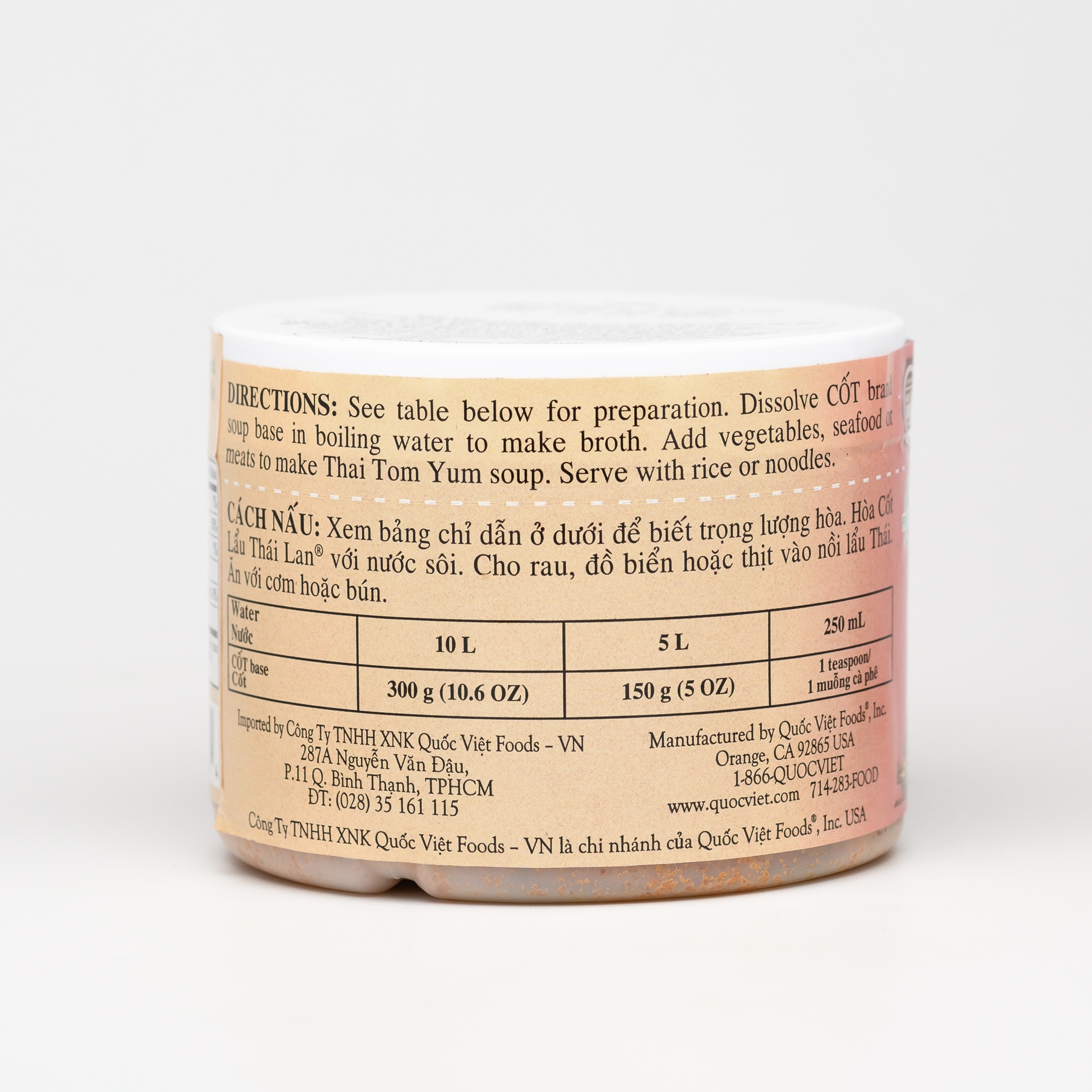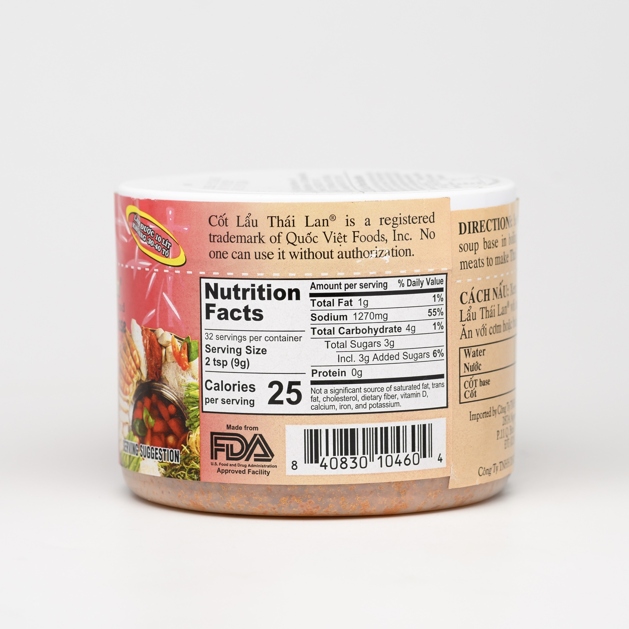 - Tên sản phẩm: Cốt Lẩu Thái® Brand – Thai Tom Yum Soup BaseThương hiệu: Quốc Việt FoodsXuất xứ: MỹThành phần: Muối, Đường, Maltodextrin, Dầu đậu nành, Acid citric , Cà chua, Chiết xuất men, Chiết xuất nấm, Chất điều vị (dinatri 5’ -inosinat 631, dinatri 5’ -guanylat 627), chiết xuất ớt màu, hương thiên nhiên, làm bằng rau quả nguyên chất, dầu sả, dầu chanh thái.