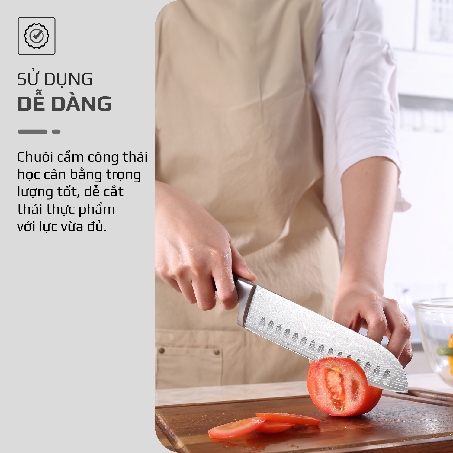 - Thiết kế công thái học giúp cân bằng trọng lượng tốt, dễ dàng thực hiện thao tác cắt, thái thực phẩm với lực vừa đủ.