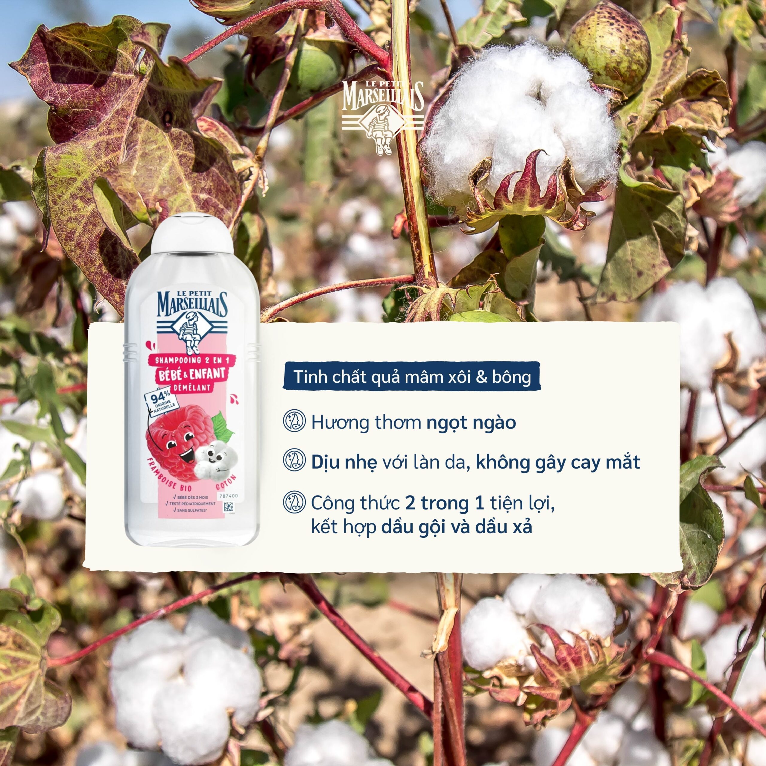 DẦU GỘI TRẺ EM 94% HỮU CƠ 2IN1 LE PETIT MARSEILLAIS 300ML quả mâm xôi & bông: