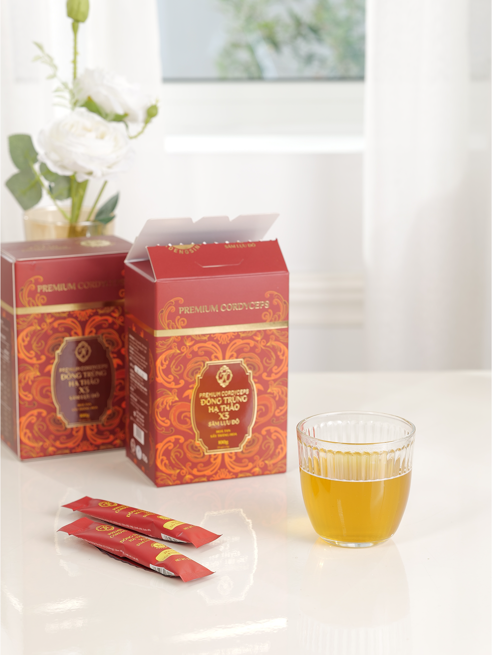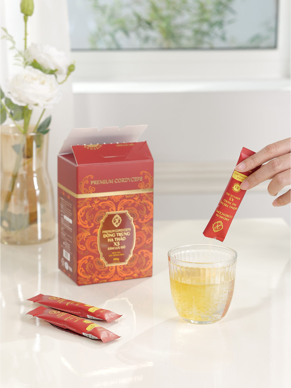 - Thành phần: – Đông trùng hạ thảo X3 (250mg)– Sâm Bắc Mỹ– Linh chi– Lựu đỏ– Maltodextrin.