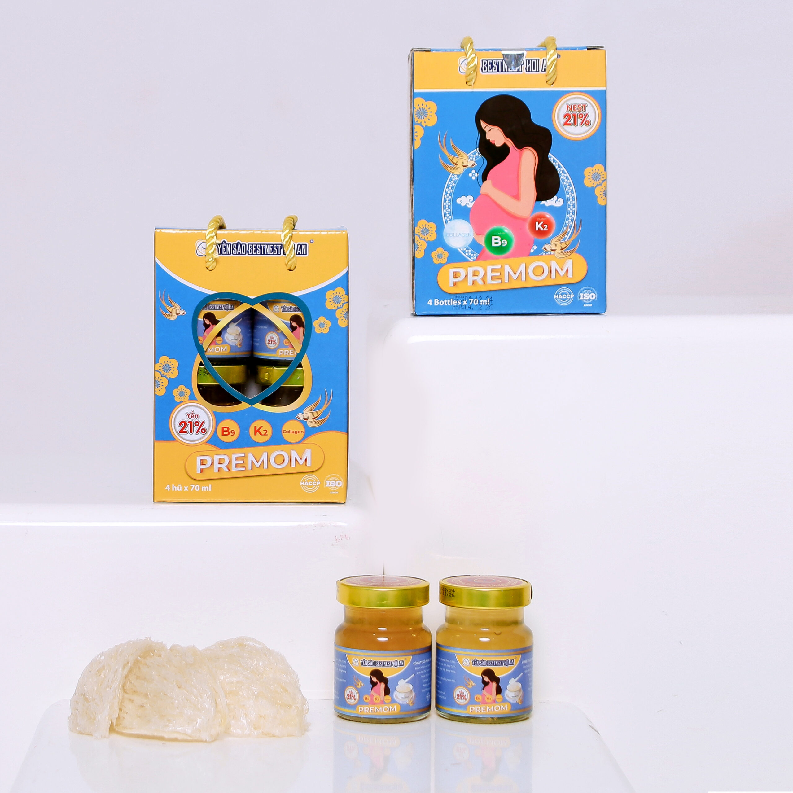 – Tổ yến chưng PREMOM là sự kết hợp giữa tinh hoa yến sào cùng với collagen và các loại vitamin thiết yếu khác, có tác dụng làm giảm thai nghén, cung cấp dưỡng chất, tăng sức đề kháng cho mẹ và thai nhi. Đặc biệt giảm rạng da, thâm nám, viêm da cơ địa khi mang thai, trầm cảm và căng thẳng cho mẹ bầu.