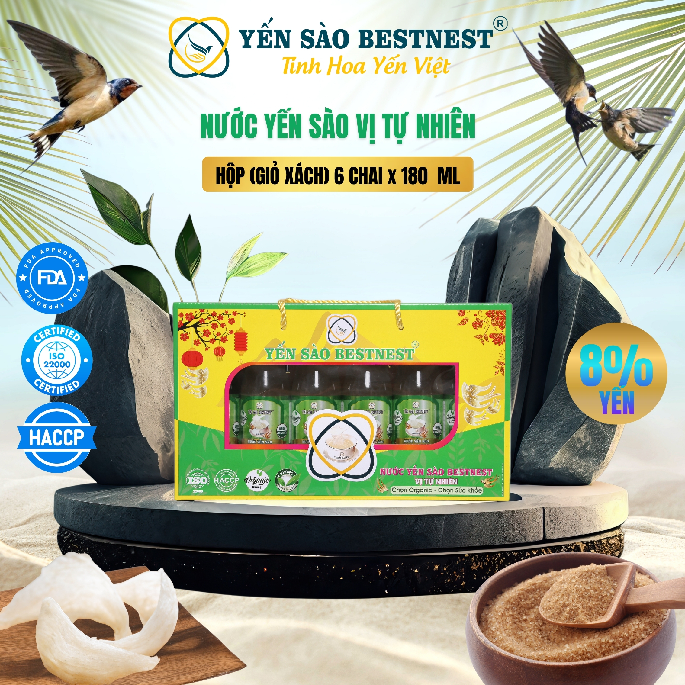 - Thành phầnSợi yến (8%), Đường Organic, Nước, Chất làm dày (327), Chất ổn định (401), Hương liệu tổng hợp dùng trong thực phẩm.
