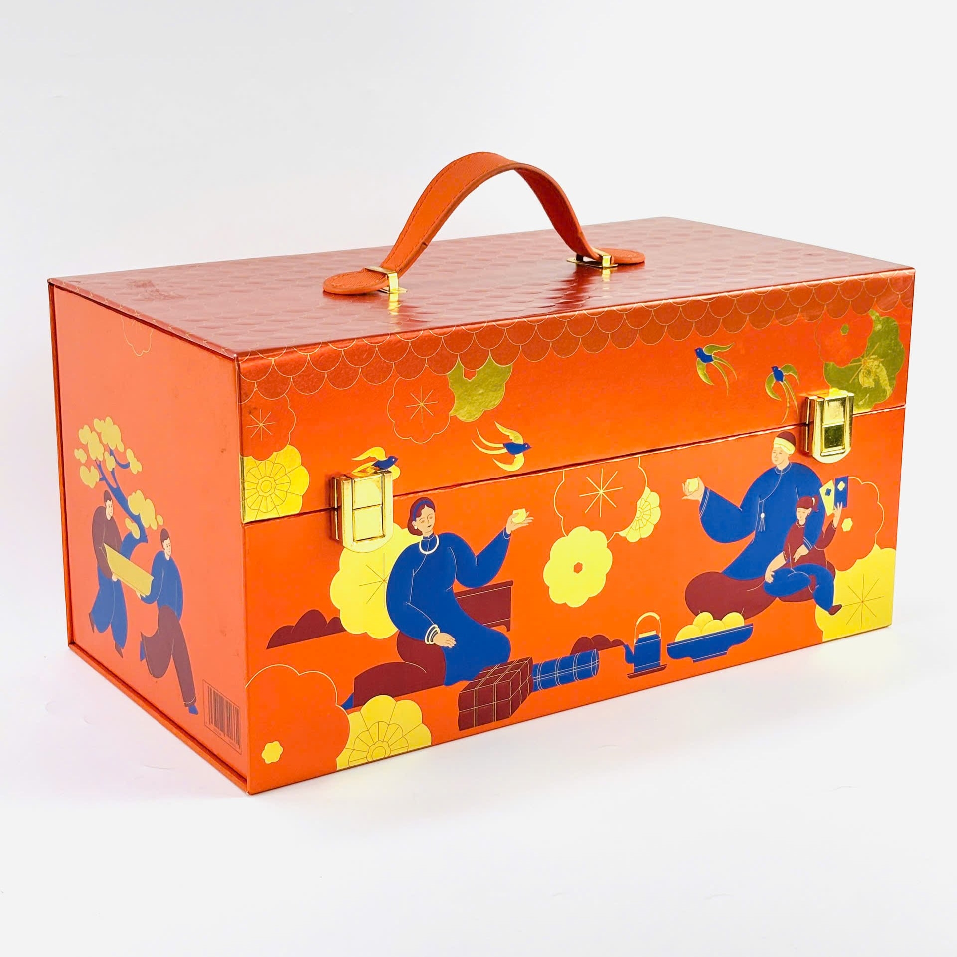 Mang phong cách khác biệt, “Xuân Sum Vầy Premium 02” được thiết kế hộp vali cam 2 tầng sang trọng. Toàn bộ bề mặt hộp được cán vân cao cấp, tạo cảm giác mềm mại và thanh nhã khi chạm tay. Họa tiết trái cây xuân được ép kim toàn bề mặt, ánh vàng nhẹ nhàng phản chiếu dưới ánh sáng, kết hợp cùng kỹ thuật bế nổi thủ công sắc nét, mang dấu ấn mỹ thuật truyền thống. Thiết kế vừa hiện đại, vừa sâu sắc về giá trị văn hóa – là lựa chọn trang nhã để trao tặng gia đình, đối tác và những người trân quý trong mùa Tết.
