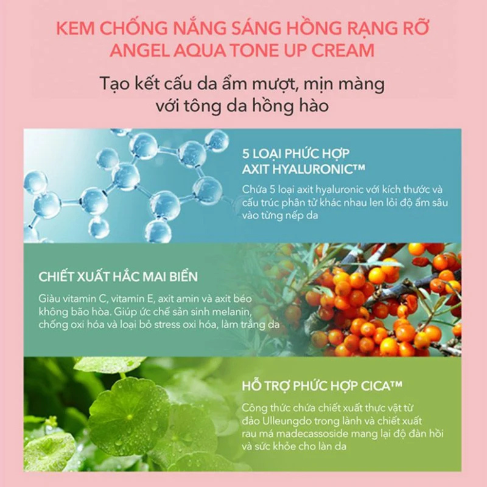 - Thành phần:Kem chống nắng nâng tông quang phổ rộng, kiêm kem lót trang điểm với thành phần thuần chay cho hiệu quả dưỡng da , mang lại sắc hồng tự nhiên và bảo vệ da Thành phần chính: + Cây Nga Sâm giúp làm dịu da và kháng viêm, được gieo trồng và thu hoạch tại đảo Ulleung trong lành Chiết xuất Rau má: Hỗ trợ kháng viêm và làm dịu vết thương, làm dịu các kích ứng da như mẫn đỏ, ngứa, điều chỉnh thúc đẩy tổng hợp collagen, mang lại độ đàn hồi cho da Chiết xuất Hắc Mai Biển: Chứa Vitamin C, E, Axit amin và Axit béo không bão hoà, ức chế sản sinh melanin, hỗ trợ làm sáng da và đều màu da 5.