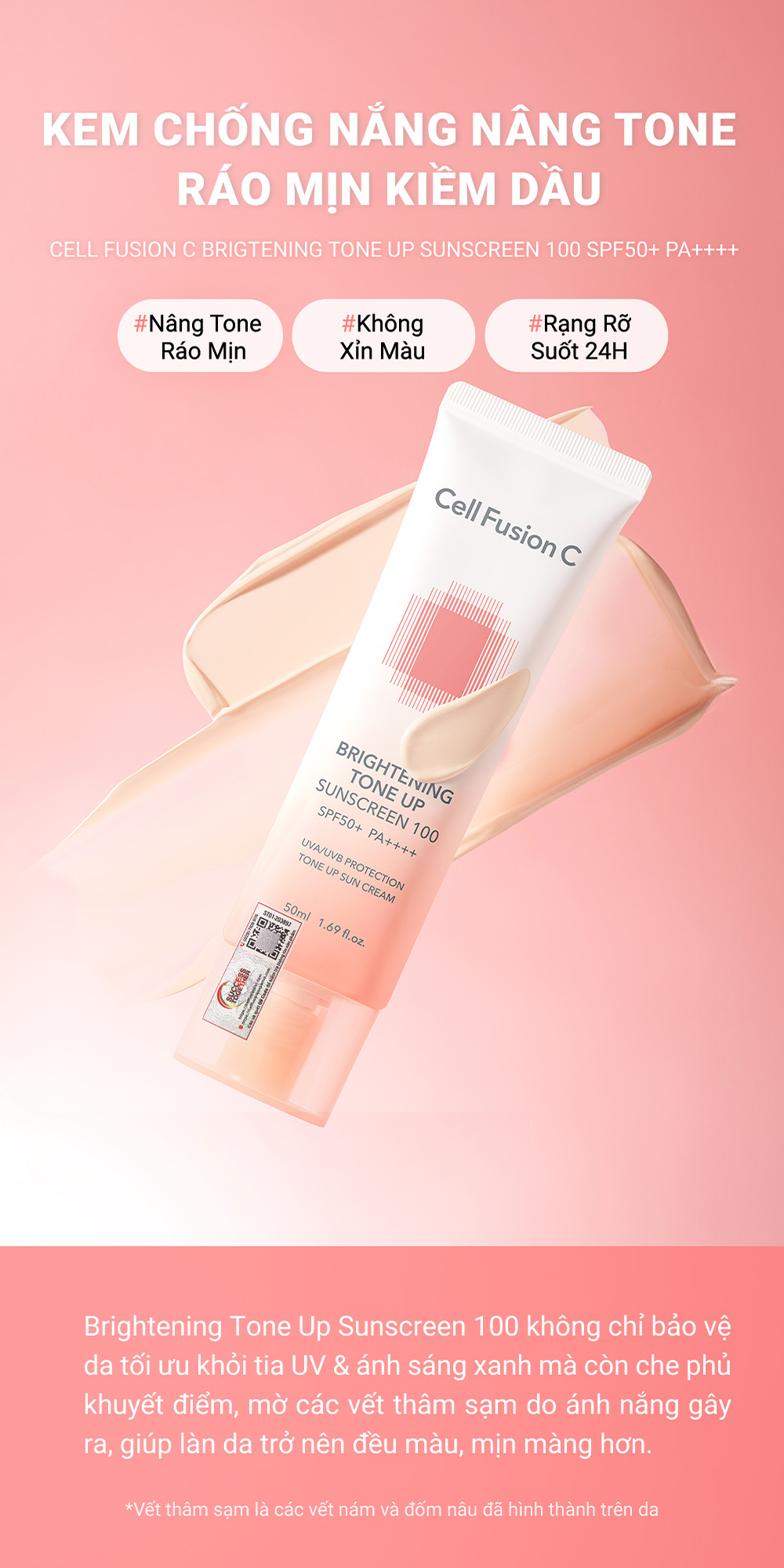 - Kem Chống Nắng Hỗ Trợ Dưỡng Trắng Nâng Tone Kiềm Dầu Cell Fusion C Brightening Sunscreen 100 SPF50+/ PA++++ bảo vệ da trước ánh nắng mặt trời, giúp cải thiện độ đàn hồi, làm mờ các vết thâm, nám, sạm và hỗ trợ nâng tông da.