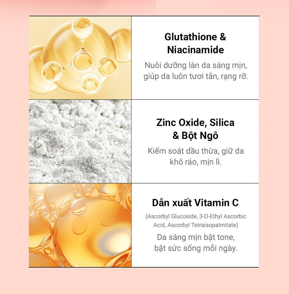 - Thành phần chính:- Chiết xuất Vitamin C: hỗ trợ làm sáng da, tránh tình trạng bí tắc lỗ chân lông- Niacinamide: giải quyết các vấn đề da mụn, da sạm màu, da mất nước.