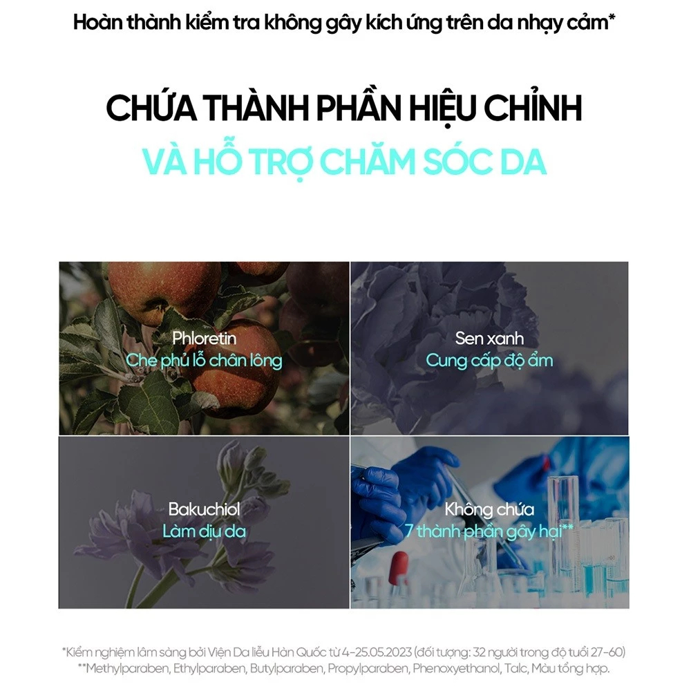 - Thành phầnCYCLOPENTASILOXANE, WATER, HDI/TRIMETHYLOL HEXYLLACTONE CROSSPOLYMER, ISODODECANE, DIMETHICONE, PEG-10 DIMETHICONE, DIMETHICONE CROSSPOLYMER, BUTYLENE GLYCOL, VINYL DIMETHICONE/METHICONE SILSESQUIOXANE CROSSPOLYMER, GLYCERIN, DIMETHICONE/VINYL DIMETHICONE CROSSPOLYMER, PANTHENOL, NYMPHAEA CAERULEA FLOWER WATER, 1,2-HEXANEDIOL, DISTEARDIMONIUM HECTORITE, MAGNESIUM SULFATE, SORBITAN SESQUIISOSTEARATE, FRAGRANCE, BENZYL BENZOATE, BENZYL SALICYLATE, LINALOOL, ALPHA-ISOMETHYL IONONE, GERANIOL, LIMONENE, GERANIOL, LIMONENE, HYDROXYCITRONELLAL, COUMARIN, BEESWAX, SILICA, PALMITIC ACID, STEARIC ACID, SILICA SILYLATE, ALCOHOL DENAT, BAKUCHIOL, CI 77220 (CALCIUM CARBONATE), ASIATICOSIDE, MADECASSIC ACID, ASIATIC ACID, PHLORETIN, CITRUS UNSHIU PEEL EXTRACT 2.