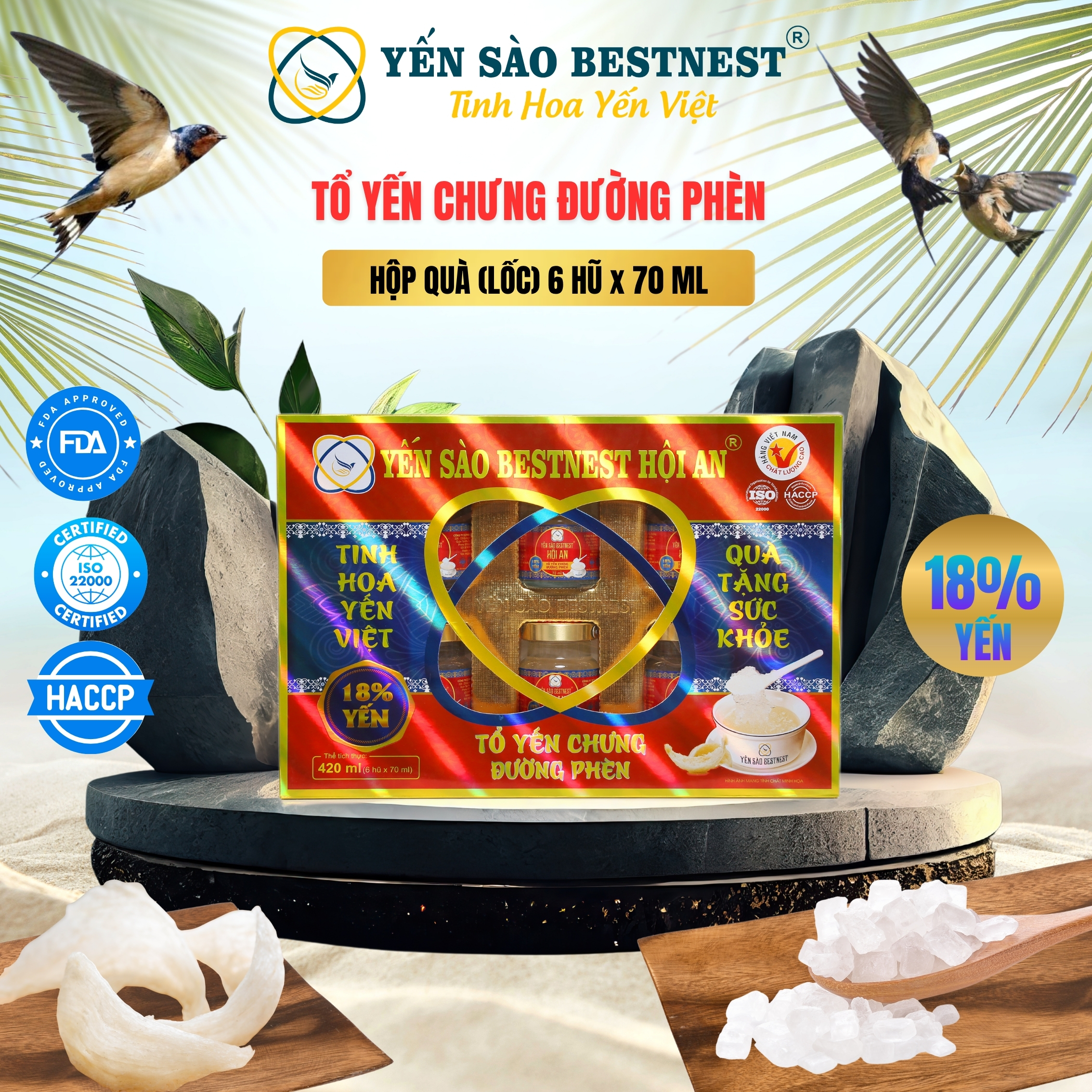 • Nguồn gốc xuất xứYến Hội An, Yến Cù Lao Chàm thuộc tỉnh Quảng NamQuy cách đóng góiHộp quà x 6 hũ x 70mlChứng nhận, Chứng chỉ- HACCP, ISO22000- Thương hiệu, nhãn hiệu và sản phẩm đã được đăng ký sở hữu trí tuệ và thương hiệu đã được nhà nước bảo hộ độc quyền.