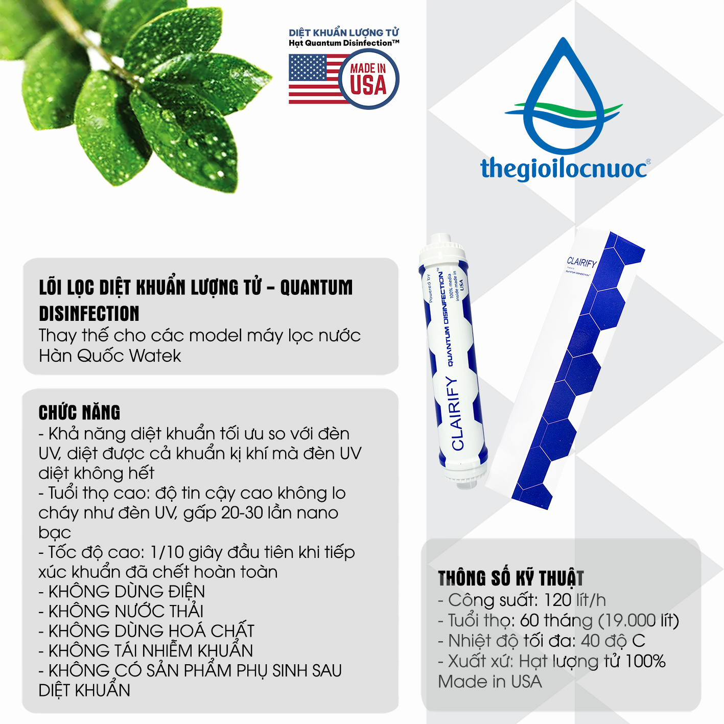 - LÕI LỌC DIỆT KHUẨN LƯỢNG TỬ - QUANTUM DISINFECTIONPHÂN LOẠIThay thế cho các model máy lọc nước Hàn Quốc WatekTHÔNG SỐ KỸ THUẬT- Công suất: 120 lít/ h- Tuổi thọ: 60 tháng (19.