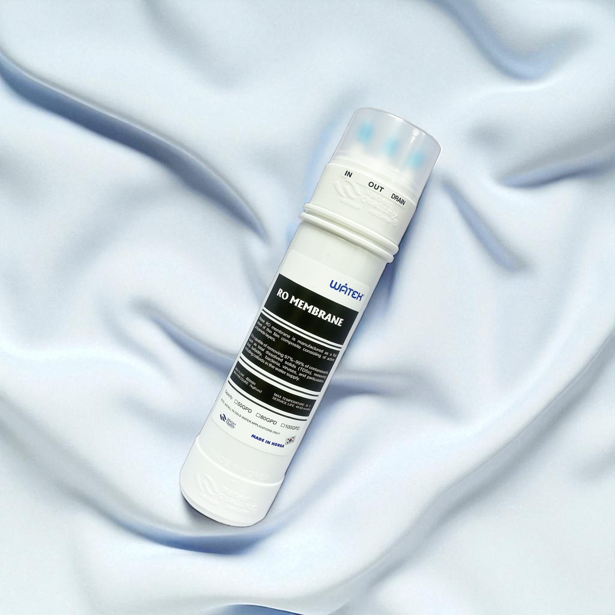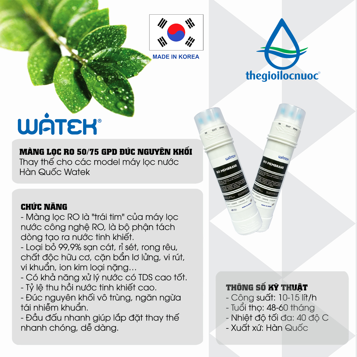 • MÀNG LỌC RO 50/75 GPD ĐÚC NGUYÊN KHỐIPHÂN LOẠIThay thế cho các model máy lọc nước Hàn Quốc WatekTHÔNG SỐ KỸ THUẬT- Công suất: 10-15 lít/h- Tuổi thọ: 48-60 tháng- Nhiệt độ tối đa: 40 độ C- Xuất xứ: Hàn Quốc CHỨC NĂNG- Màng lọc RO là "trái tim" của máy lọc nước công nghệ RO, là bộ phận tách dòng tạo ra nước tinh khiết.