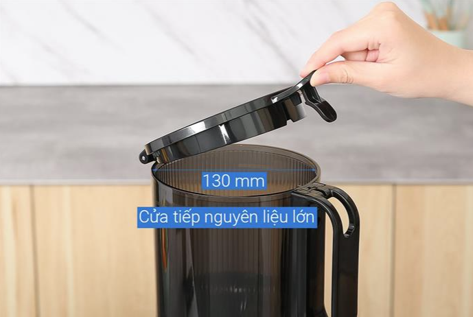 - Máy ép trái cây chậm đường kính ống ép trái cây lớn lên đến 130 mm giúp bạn thoải mái ép hoa quả nguyên trái mà không phải mất công cắt nhỏ