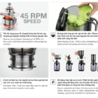 - Tốc độ vòng quay 45 vòng/phút ép kiệt bả trái cây và giúp giữ nguyên dưỡng chất có trong nguyên liệu