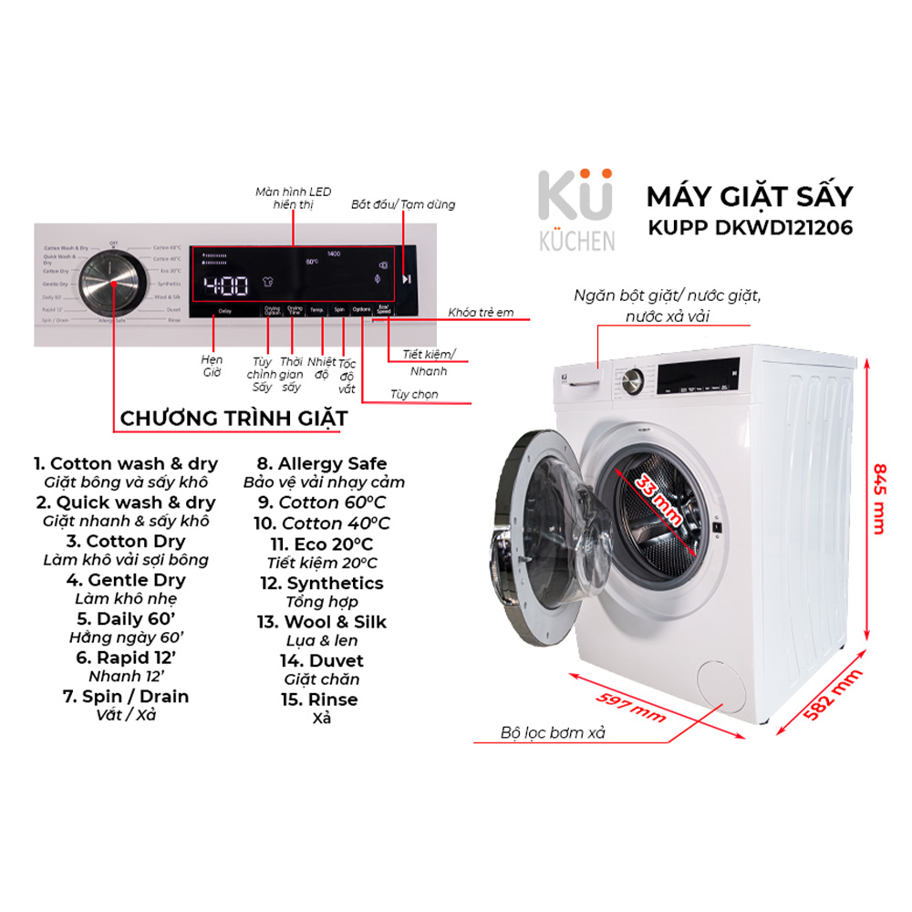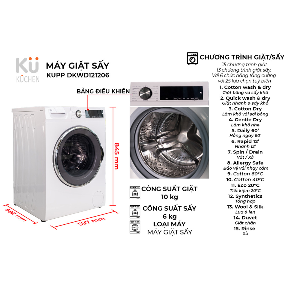 - Nhãn hiệu: KU KUCHENMã sản phẩm: 121206Khối lượng giặt/ sấy: 10 kg/ 6kgCông suất: 2200 WChiều dài dây (cm): 175 cmKích thước (HxWxD) (mm): 845 x 597 x 582 mmVật liệu thùng chứa: 304Độ ồn khi quay: 53 – 76 dB(A)Hiệu quả của vắt khô: ATốc độ quay: 1400 vòng/ phútMức độ hiệu suất sử dụng năng lượng: ATiêu thụ nước trung bình năm: 12100L/nămĐiện áp: 220-240 VMàu sắc: TrắngTổng trọng lượng (kg): 85 kgGiới thiệu sản phẩm:Tích hợp giặt và sấy tiện lợi, tiết kiệm diện tích, phù hợp với những khu vực nắng mưa bất thườngDKWD là lựa chọn phù hợp cho những ai đang sống tại khu vực có thời tiết thay đổi thất thường với khả năng đáp ứng nhu cầu giặt giũ cho những ngày nắng và tính năng sấy quần áo tiện lợi để sử dụng vào những ngày trời âm u.