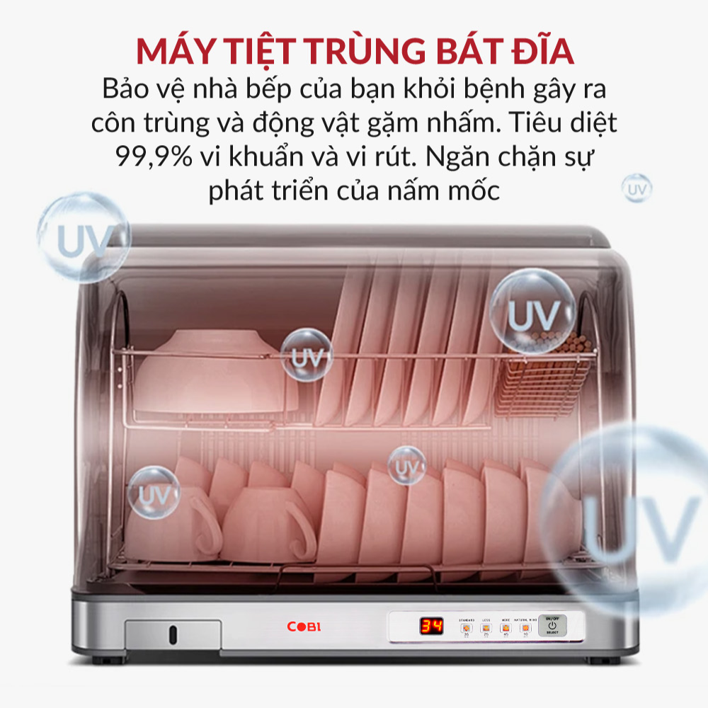 - ✅ Máy sấy bát COBI giúp khử trùng – diệt khuẩn 99,9%, bảo vệ cả gia đình khỏi tác nhân gây bệnh từ môi trường, côn trùng và động vật gặm nhấm.