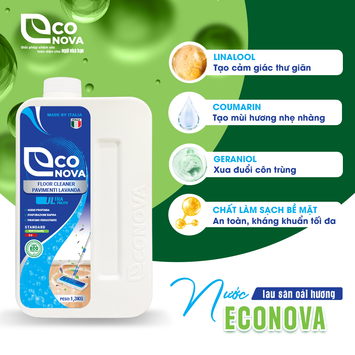 - Công dụng: Nước lau sàn oải hương ECONOVA FLOOR CLEANER PAVIMENTI LAVANDA có khả năng làm sạch các vết bẩn trên mọi bề mặt sàn như gạch, gỗ, đá và các chất liệu khác.