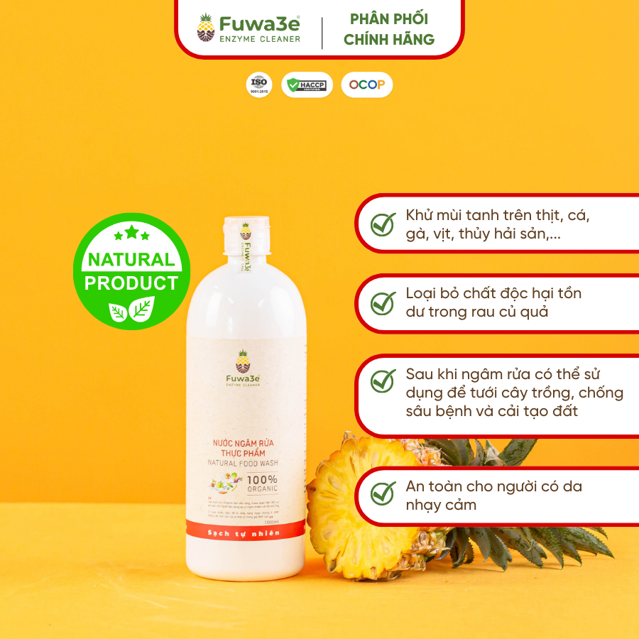 - Để bữa ăn ngon miệng và an tâm, bạn cần sử dụng nước ngâm rửa thực phẩm Fuwa3eThành phần- 100% Eco-enzyme lên men từ vỏ dứa (Protease, amylase, lipase, cellulase.