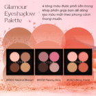 Bảng phấn mắt Glamour Eyeshadow Palette gồm 4 ô màu (lì và nhũ) được phối sẵn theo từng tông, giúp bạn dễ dàng tạo phong cách trang điểm mắt đa dạng và tự tin tỏa sáng.
