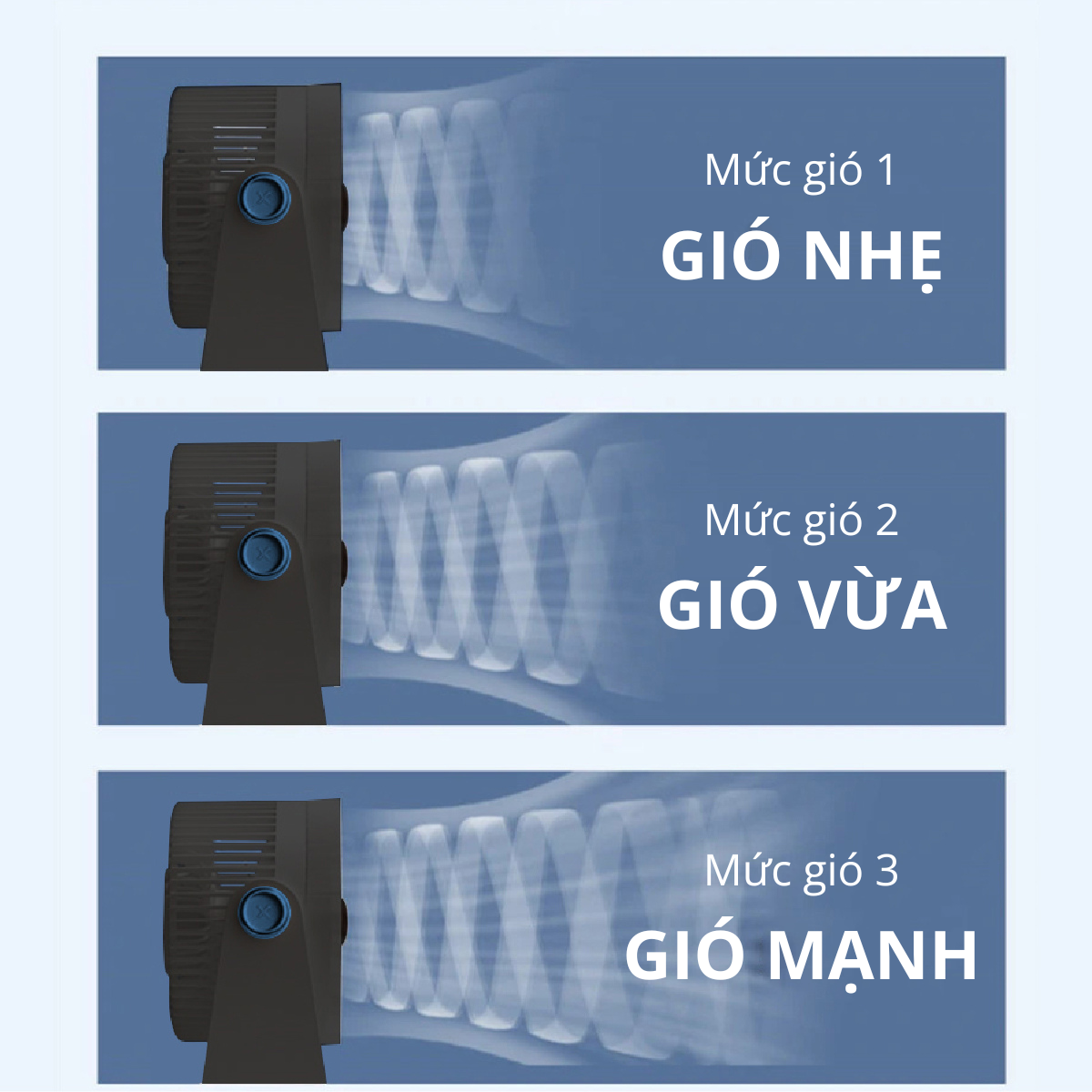 Sử dụng liên tục nhiều giờ, sạc dễ dàng qua cổng USB. - 3 tốc độ gió linh hoạt – Gió mạnh, đều, ổn định