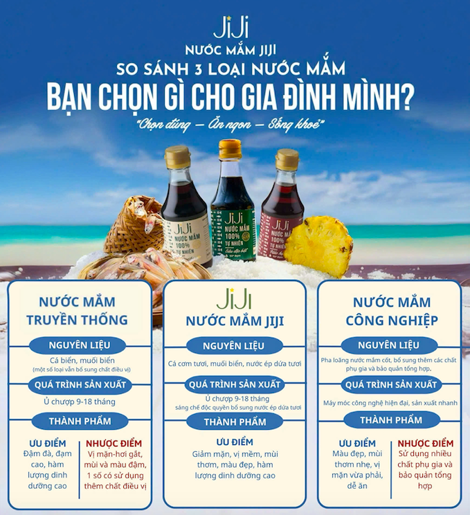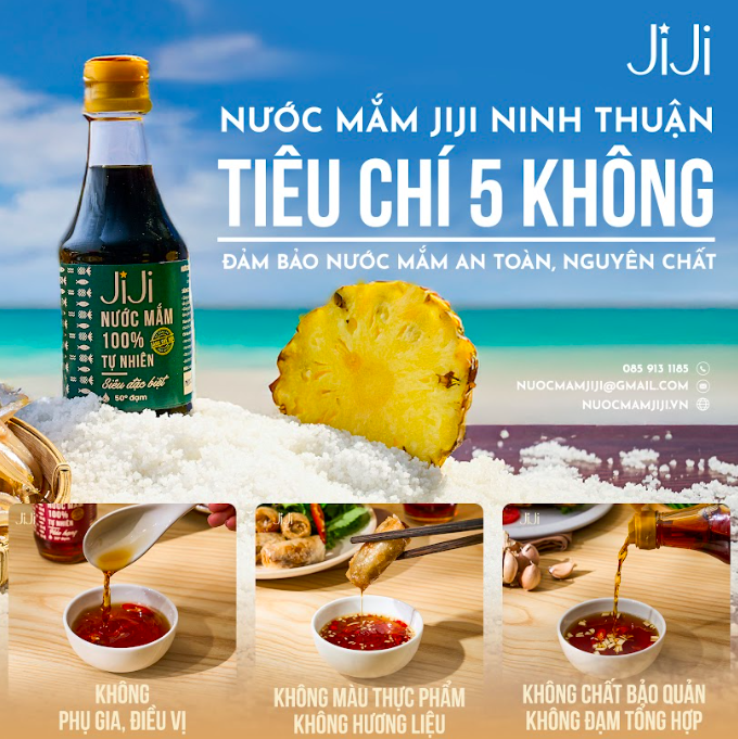 Nước mắm JiJi 100% tự nhiên, thơm ngon, giảm mặn được sản xuất tại Ninh Thuận theo phương pháp ủ chượp truyền thống từ nguyên liệu hoàn toàn tự nhiên: cá cơm tươi và muối biển. Sau khi ủ chượp 12 tháng kết hợp với sáng chế độc quyền dùng nước ép dứa tươi để làm mềm vị, giảm mặn, thay thế toàn bộ chất phụ gia, điều vị nhưng vẫn giữ được nguyên hương vị tự nhiên của nước mắm truyền thống.