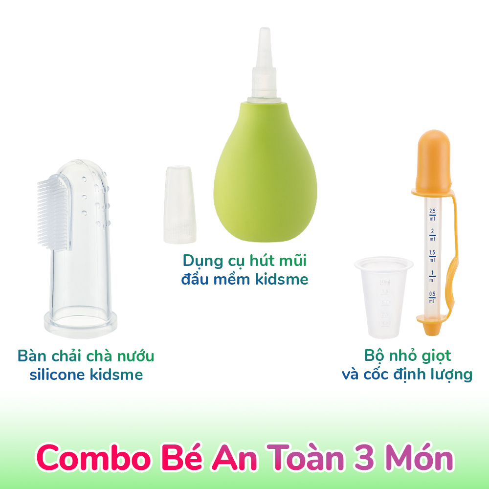 - Công dụng: Trọn bộ sản phẩm cao cấp đến từ thương hiệu kidsme – Anh Quốc giúp chăm sóc Bé dễ dàng, an toàn: *Dụng cụ hút mũi cho Bé giúp giữ sạch khoang mũi, bảo vệ niêm mạc mũi, lý tưởng cho trẻ sơ sinh.