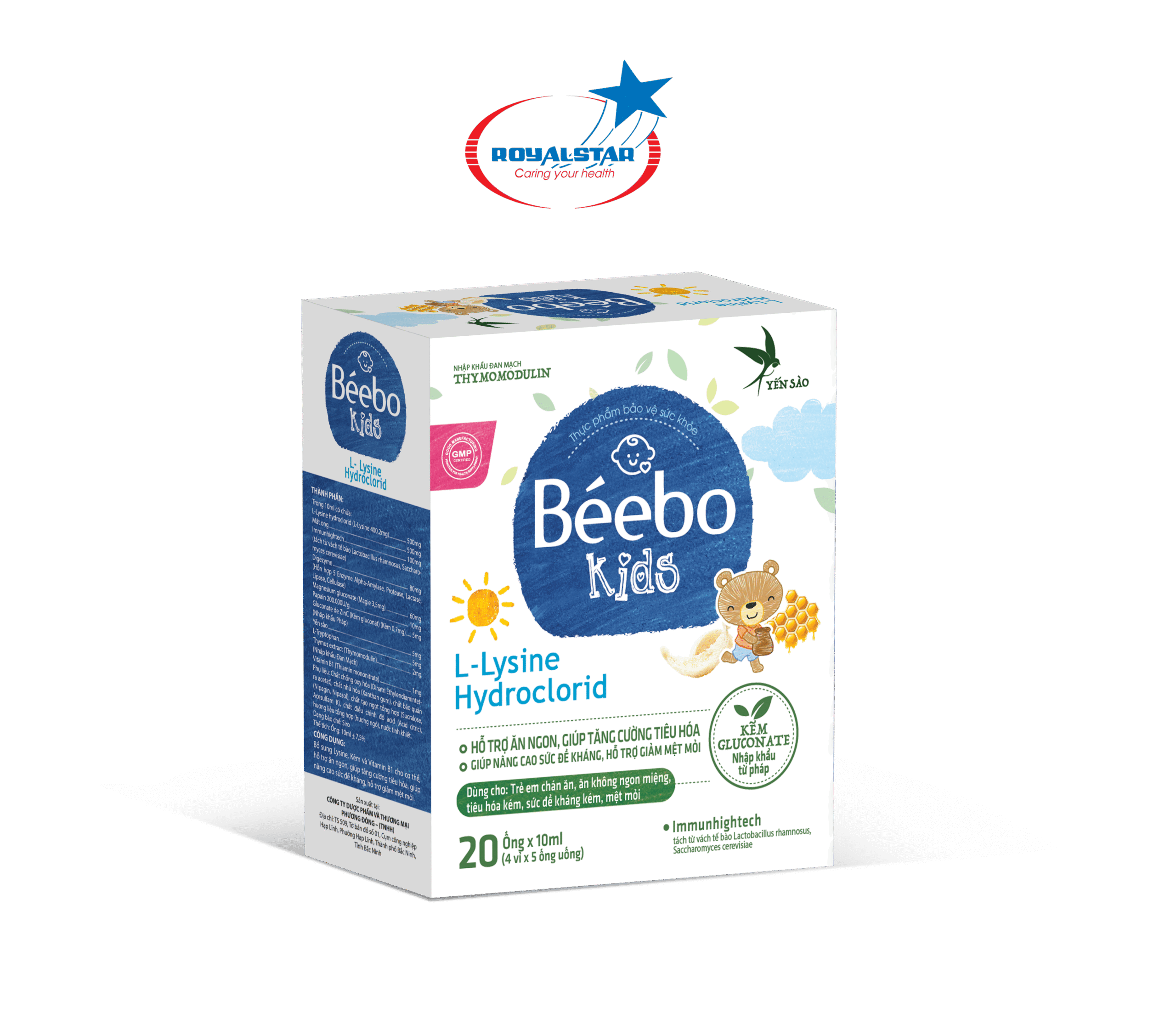 - Thành phần trong mỗi 10ml có chứa: Thành phần Hàm lượngLysine HCL500mgMật ong500mgImunhightech100mgHỗn hợp 5 enzym: (Alpha- Amylase, Protease, Lactase, lipase, cellulase)80mgMagiesium gluconate60mgPapain 200.