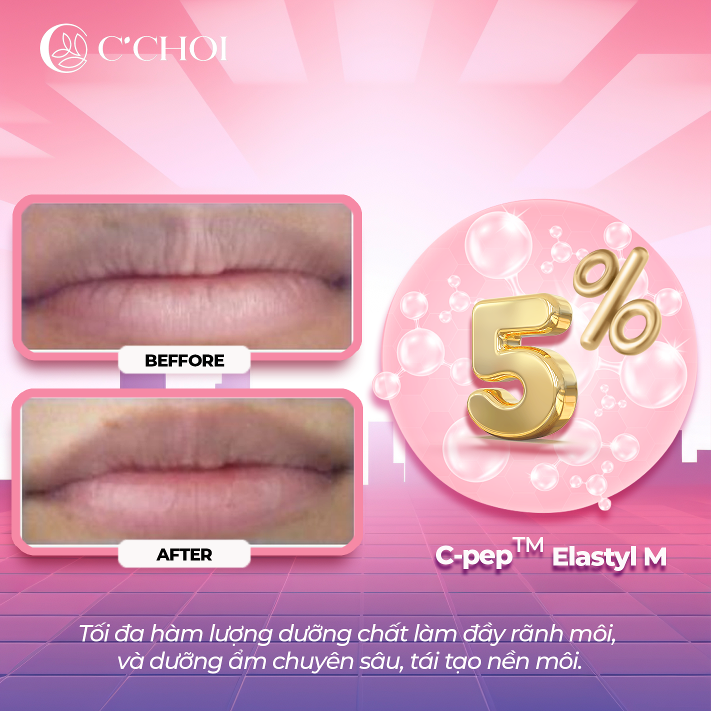 Son dưỡng dạng lỏng, chứa hàm lượng C- Peptide Elastyl CC cao tối đa giúp đẩy nhanh quá trình loại bỏ da chết, tái tạo nền môi căng mướt, hồng hào tự nhiên.